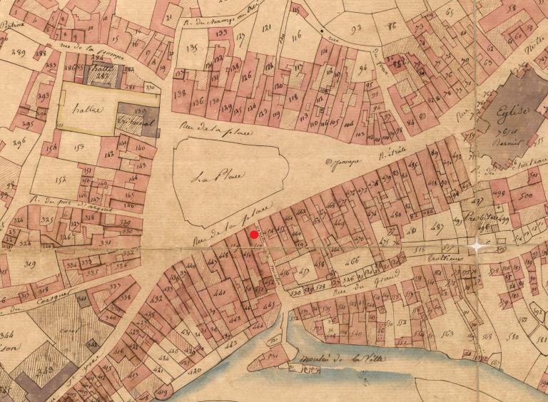 Plus haute que ses voisines avec ses trois étages plus combles, cette maison donne sur la place centrale d'une part et sur la venelle conduisant au Trieux d'autre part (actuelle venelle du Moulin de la ville). Le rez-de-chaussée commercial comporte une porte centrale encadrée de deux vitrines, surmontées d'accolades gravées dans la sablière. Seuls le premier et deuxième étage sont en encorbellement avec entretoises. Des poteaux corniers semblent en effet monter "de fond" sur la hauteur du 2e et 3e étage. Cette disposition peut être rapprochée du n°2 rue Saint-Yves : le 2e étage y est en effet beaucoup plus haut qu'un étage classique, avec des poteaux corniers longs.