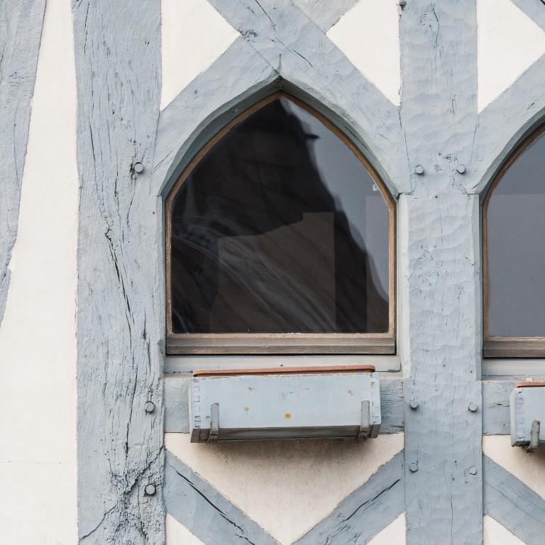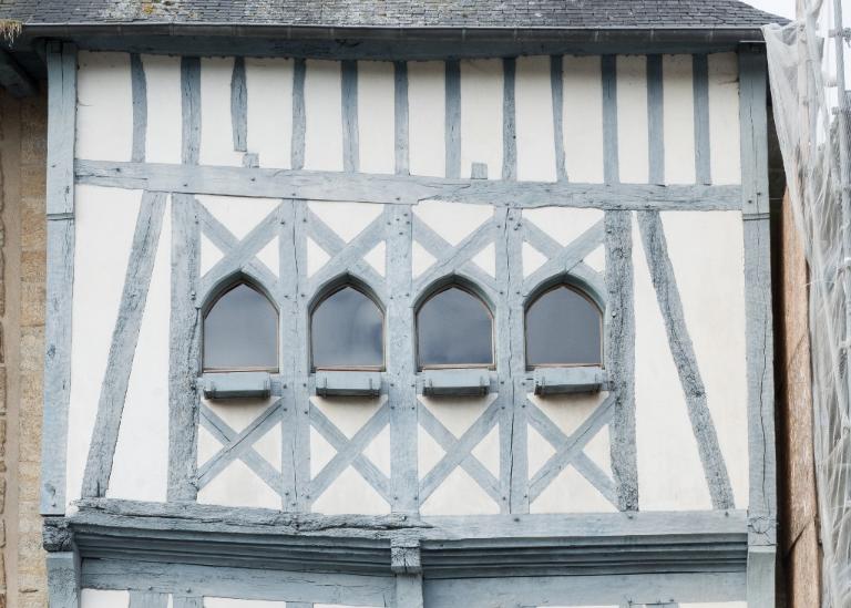 Un poteau central divise le premier étage en deux parties symétriques. Une claire-voie de quatre petites fenêtres restituées avec croix de Saint-André en allèges éclaire cet espace. Leur linteau est formé d'une croix de Saint-André dont la partie basse dessine une accolade. Une écharpe simple contrevente les extrémités du niveau. Le second étage est lui aussi en encorbellement, avec de longues entretoises moulurées. Il suit le même schéma structurel que le premier. Un surcroît avec potelets termine la façade.