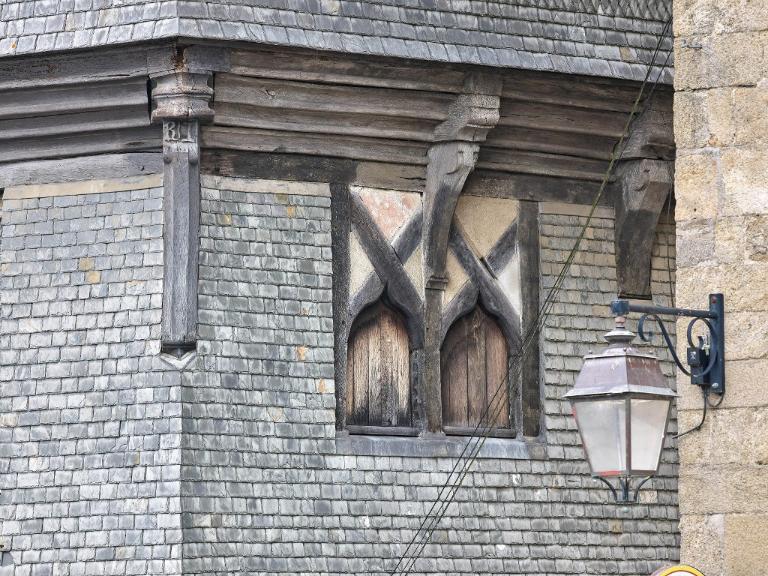Les poteaux du rez-de-chaussée créent quatre ouvertures dont trois sur un mur-bahut remaçonné. Chaque baie est surmontée d'une accolade sculptée dans le linteau. Entretoises et sablières sont moulurées et les consoles sont sculptées d'un motif similaire au n°31 de la place. Au premier étage, un aisselier gravé des initiales R et I renforce l'angle et soutient le coyer. La ferme débordante du pignon présente un décor trilobé.