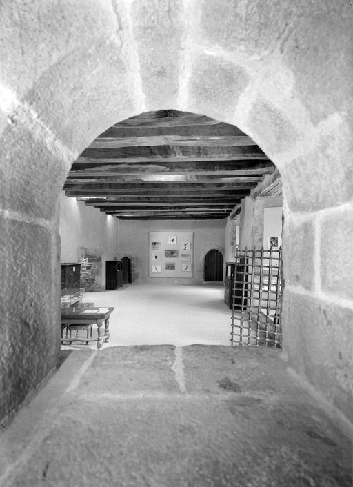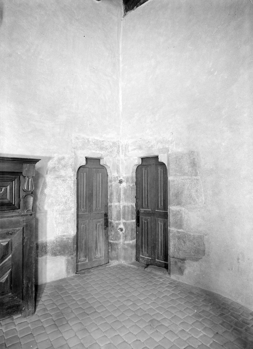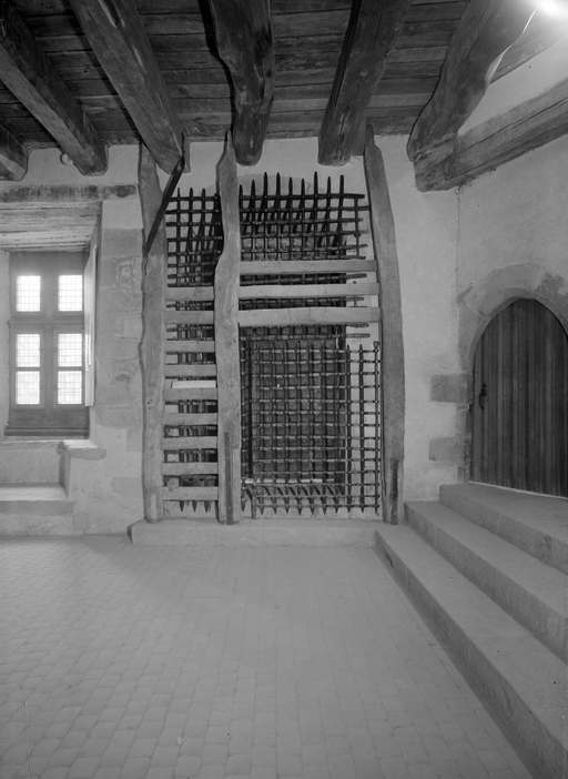 L’entrée monumentale est en arc brisé à voussure : elle est surmontée d’une niche trilobée destinée à abriter un décor héraldique. Les portes intérieures sont tantôt en arc brisé, tantôt à linteau droit sur coussinets ou à linteau droit. Les arcs des passe-plats sont en anse de panier.