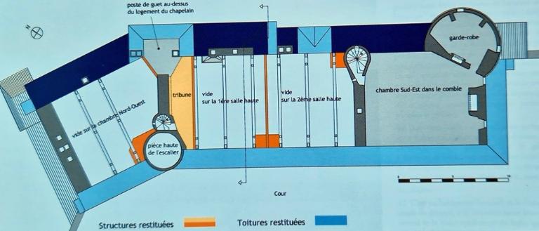 Un corps de garde chauffé et éclairé en second jour est identifié au niveau du chemin de ronde ainsi qu’une pièce située au rez-de-chaussée de la tour rectangulaire ayant vue directe sur la porte d’entrée. Un second corps de garde pouvait prendre place dans la tour sud-est.