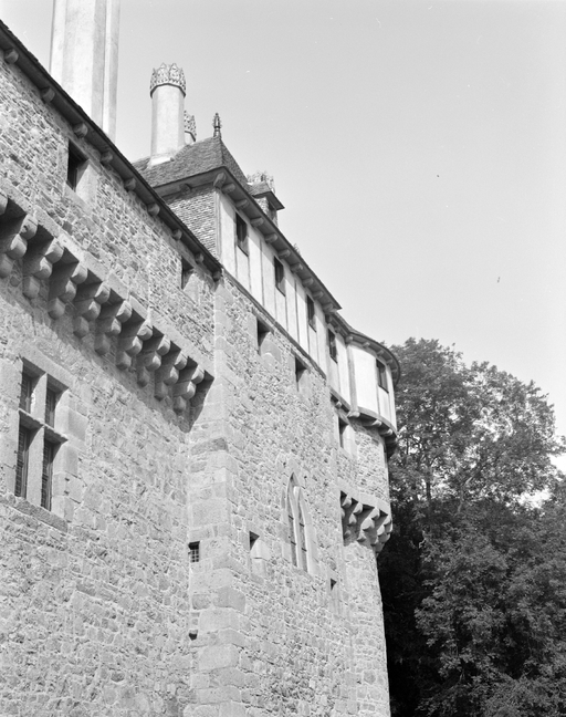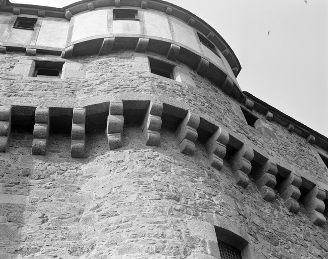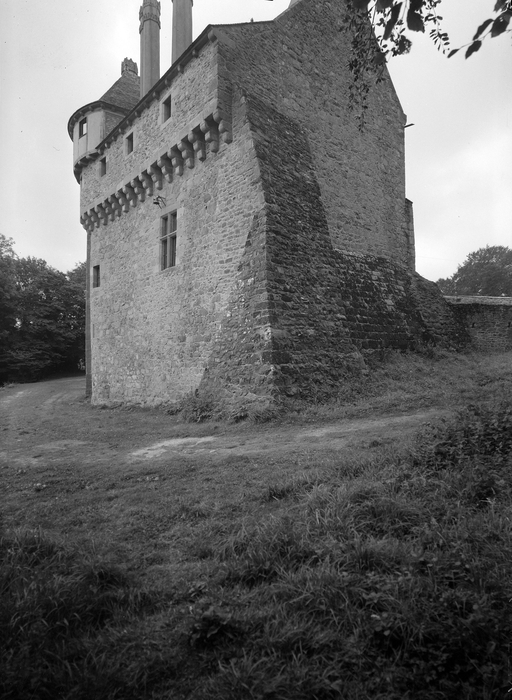 Les tours nord-est et sud-est ainsi que le chemin de ronde (situé au deuxième étage) sont flanqués de mâchicoulis supportés par trois niveaux de consoles. La coursière en encorbellement - disparue - pouvait également fonctionner comme un chemin de ronde défendant la façade principale et le pignon sud. Fenêtres à vantaux et créneaux de pied pouvaient permettre des tirs lointains ou fichant.