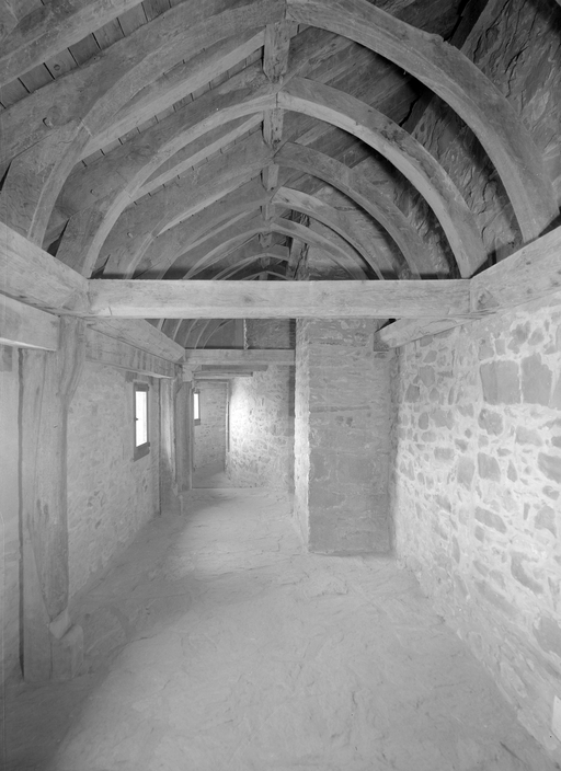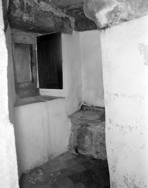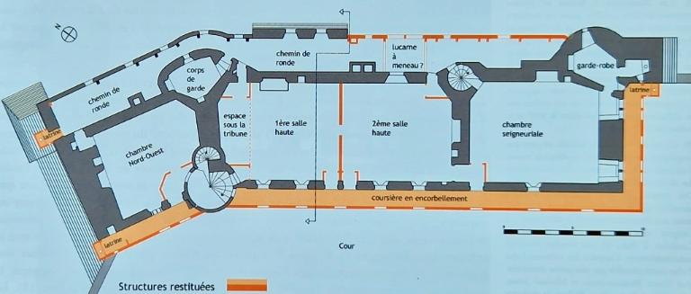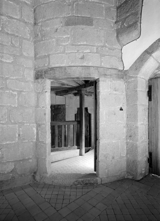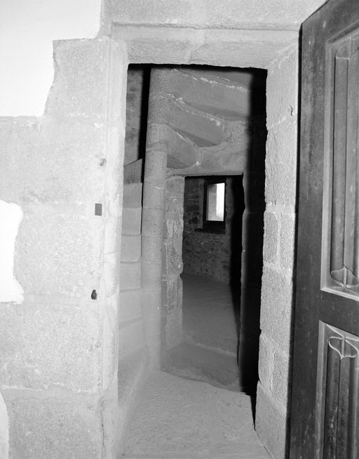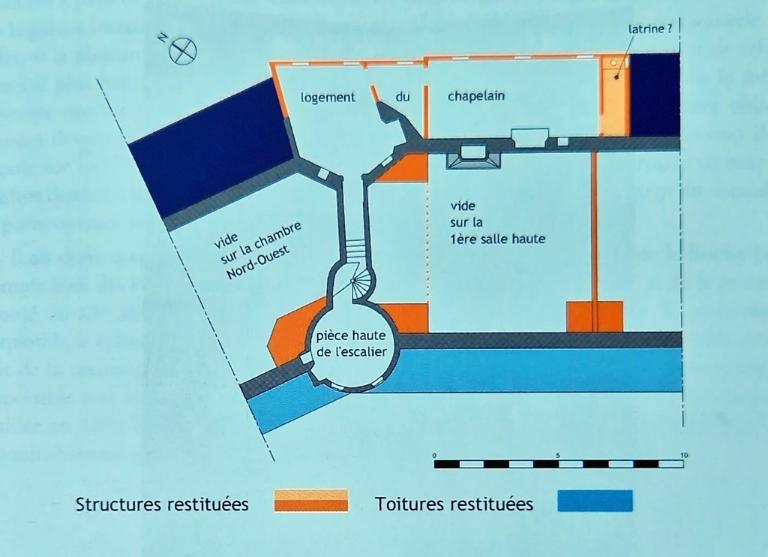 A ce niveau, l’escalier en vis dessert quatre espaces distincts : la salle haute nord, la chambre nord-ouest, le couloir menant au logement du chapelain (étage supérieur intermédiaire) et la coursière en encorbellement servant à la distribution horizontale. Pour éviter les courants d’air depuis le chemin de ronde et la coursière, les portes sont dotées de tambour.
