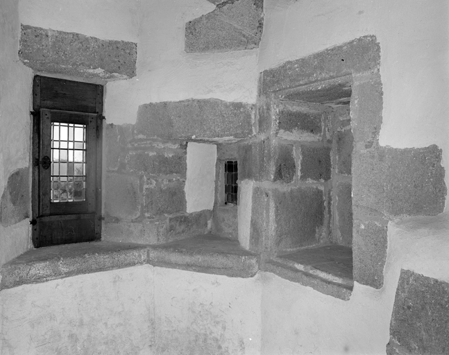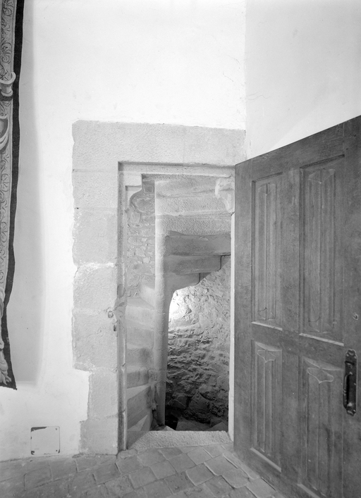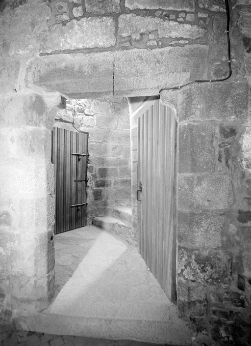 Dans l’angle sud-est se trouvent deux portes : la première donne accès à la poterne, la seconde à un escalier en vis assurant la distribution verticale sur quatre niveaux.