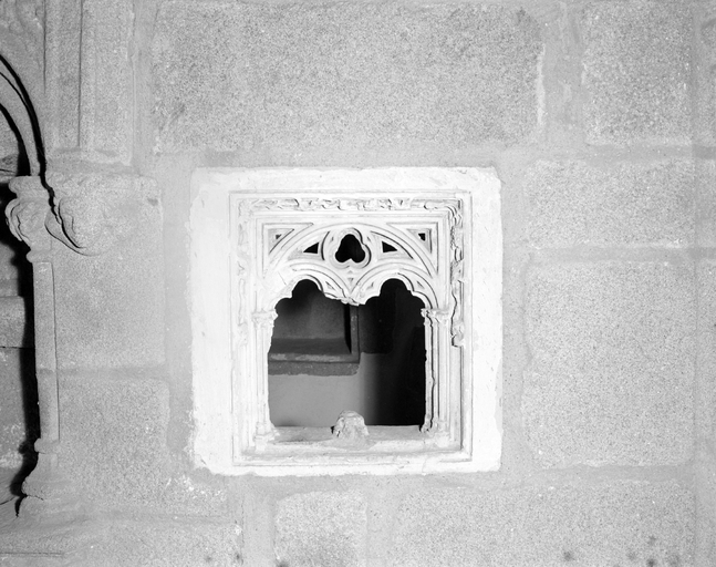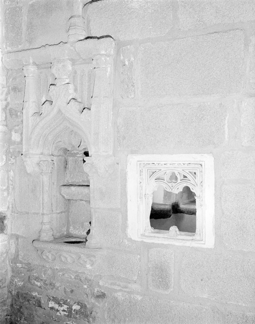 Les deux hagioscopes à claire-voie en calcaire des deux oratoires de la chapelle sont de style rayonnant : ils sont ornés en sus de pampres de vigne portant grappes et feuilles où courent des escargots (uniquement pour celui du sud). La fenêtre sur cour de la chambre seigneuriale, la crédence lavabo de la chapelle en pierre de taille de granite - ajoutée ultérieurement comme le montre l’interruption des colonnettes d’angle de l’arcade - arborent en revanche un décor gothique flamboyant.