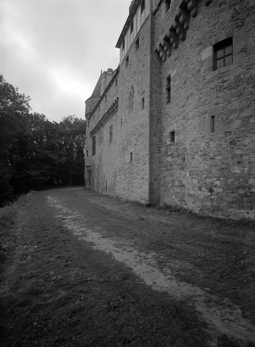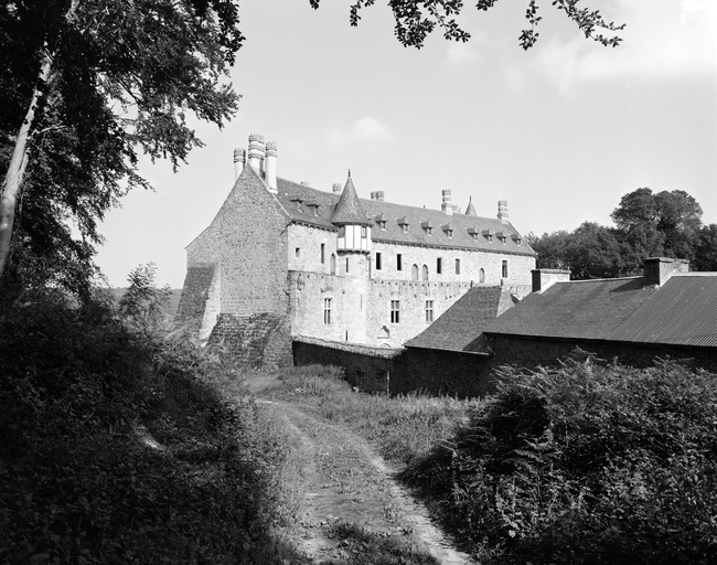 Le château actuel est adossé à une enceinte défensive préexistante qui témoigne du château primitif démantelé durant la guerre de Succession de Bretagne (1341-1364). Les extrémités nord et sud de l’enceinte ont peut-être été symboliquement conservées pour marquer l’ancienneté du lieu.