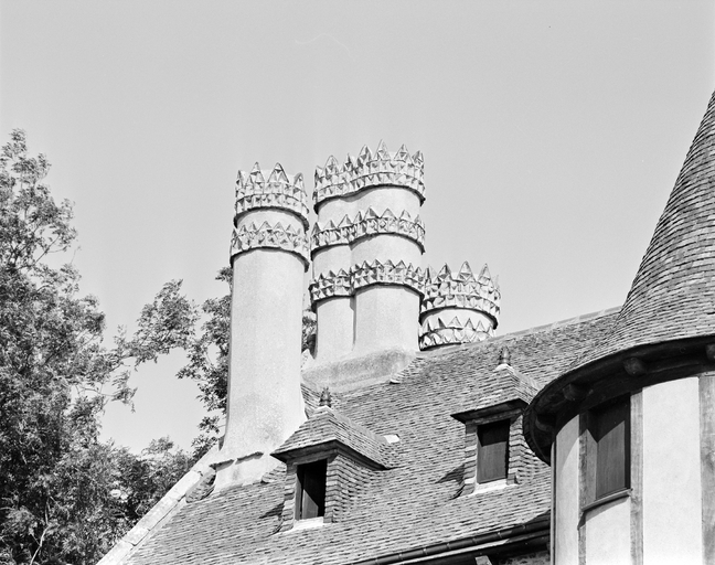 De l’imposante couverture à longs pans en ardoise émergent les couvertures en poivrière des quatre tours et celle en pavillon de la tour rectangulaire, mais aussi dix-neuf souches monumentales de cheminée.