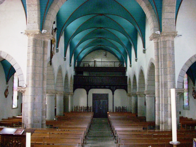Plan en croix latine à trois vaisseaux. Chevet plat. Porche sud hors-œuvre. Clocher hors-œuvre à galerie et à chambre de cloches amortie par un dôme entouré d'une balustrade. Gros œuvre en moellon de granite enduit, à l'exception des encadrements des baies, des chaînages d'angles et du massif occidental, en pierre de taille de granite. Nef à cinq travées, éclairée par des fenêtres hautes et séparée des bas-côtés par des arcades en arc brisé reposant sur des chapiteaux à motifs floraux des colonnes. Deux tribunes superposées à l'ouest. Lambris de couvrement peint en bleu et les voussures en marron. Sol couvert de ciment.