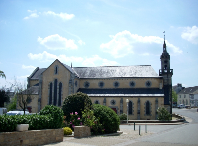 Clocher daté de 1828 selon l'inscription côté sud. Edifice agrandi d'après les plans de l'architecte diocésain Joseph Bigot en 1856 par les entrepreneurs Kerguénère et Féjean. Eglise construite en 1894 par les plans de l'architecte Armand Gassis ; sauf la façade occidentale 18e siècle de l'édifice antérieur.
