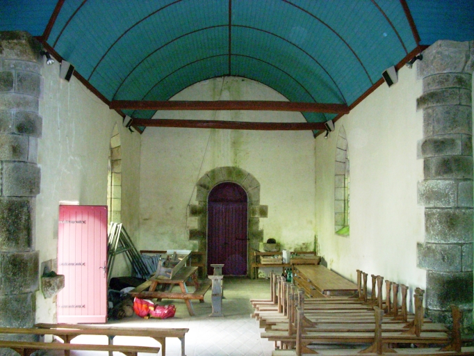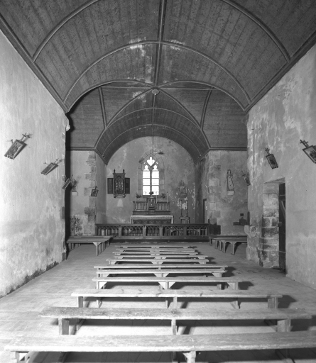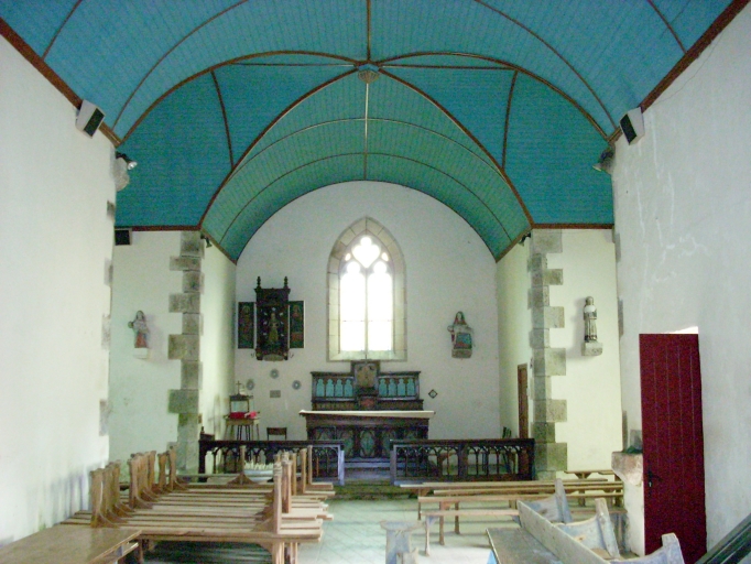 Edifice de plan en croix latine à vaisseau unique. Chœur peu profond à chevet plat flanqué d'une sacristie de plan carré au sud. Clocher-mur à chambre de cloches ajourée de plan carré surmontée d'une flèche octogonale moulurée ornée de crossettes et encadrée de frontons ajourés. Gros œuvre en moellon de granite enduit, à l'exception des encadrements des baies et des chaînages d'angle, en pierre de taille de granite. Lambris de couvrement bleu, voussures et entraits peints en marron. Sol couvert de ciment.