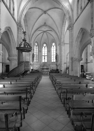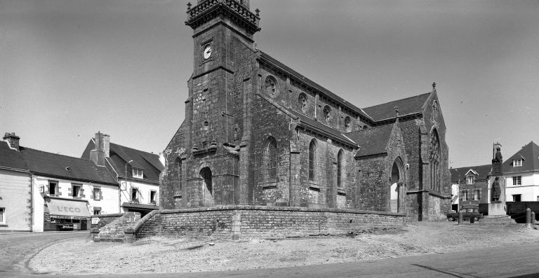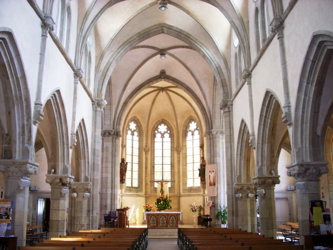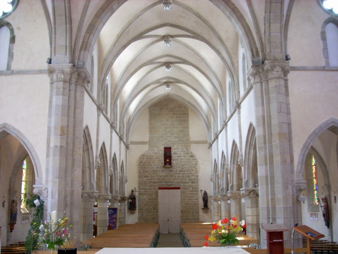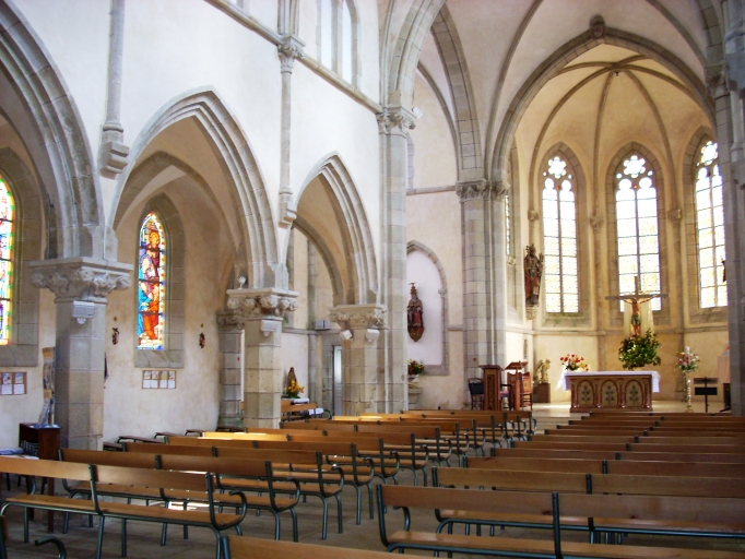 Edifice de plan en croix latine, à trois vaisseaux et à quatre travées. Chevet à pans coupés flanqué de deux sacristies de plan rectangulaire à comble à surcroît. Gros œuvre en moellon de granite enduit de crépi, à l'exception des encadrements des baies et des chaînages d'angle, en pierre de taille de granite apparente. Clocher avec galerie ajourée, chambre de cloches ajourée surmontée d'une flèche octogonale ornée de crossettes et encadrée à sa base de quatre pinacles et quatre frontons ajourés. Porche sud hors-œuvre. Voûte à croisées d'ogives éclairée par des fenêtres hautes. Arcades en arc brisé reposant sur les chapiteaux à motifs végétaux des piliers octogonaux. Sol couvert de ciment.