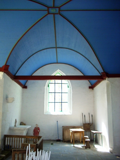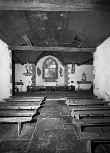 Plan en croix latine à vaisseau unique de type nef obscure avec chevet plat. Clocher-mur avec chambre de cloche carrée amortie d'un dôme à flèche carrée, encadré de quatre crochets. Gros œuvre à l'extérieur en moellon de schiste et de granite rejointoyé à la chaux et à l'intérieur en moellon et pierre de taille recouvert d'un enduit blanc. Lambris de couvrement peint en bleu et voussures ocre rouge et vert. Entraits et sablières peints en ocre rouge. Sol couvert de dalles d'ardoise. Réemploi d'une pierre tombale pour servir d'autel.