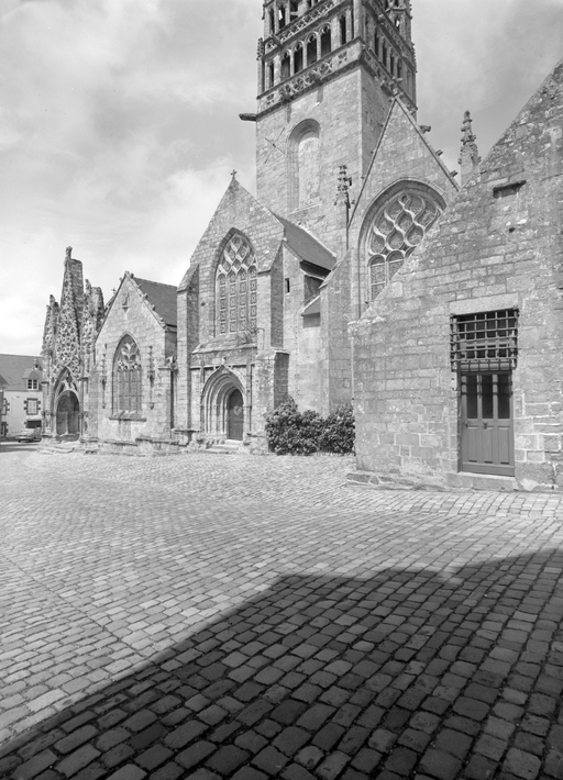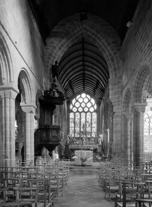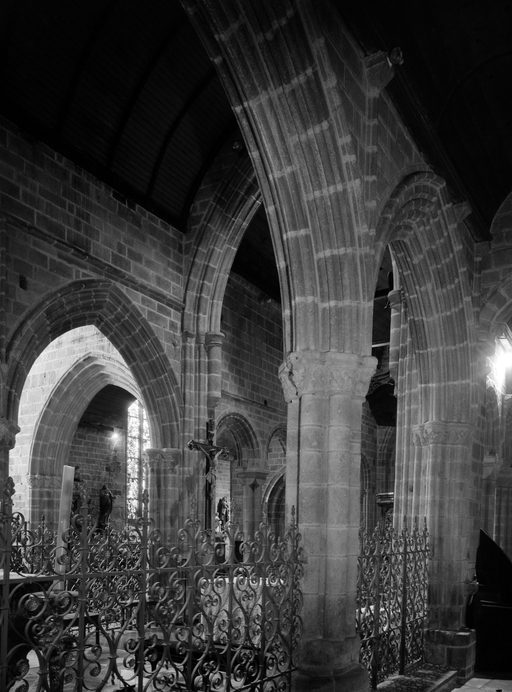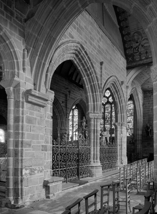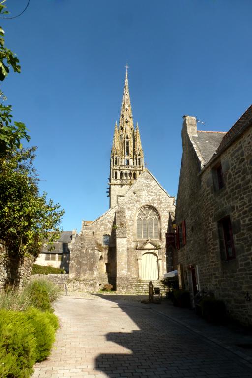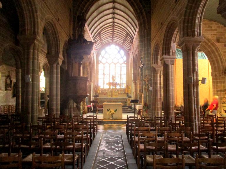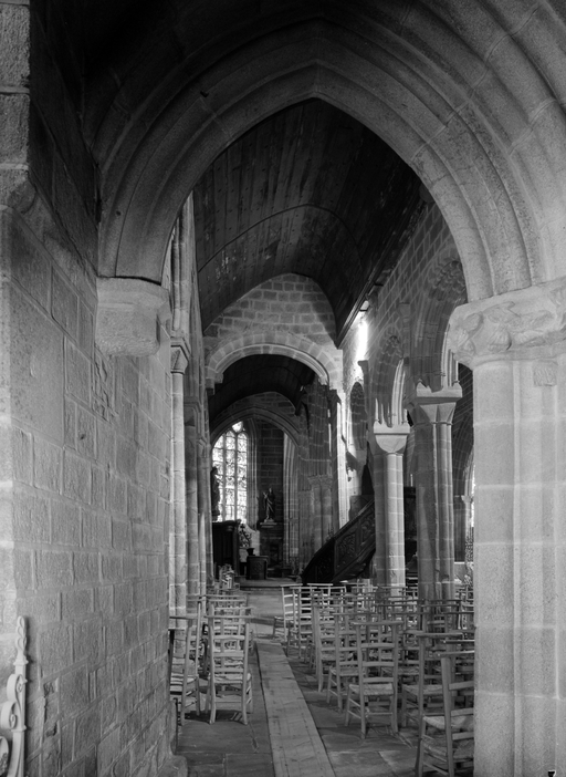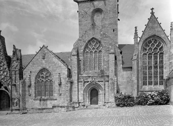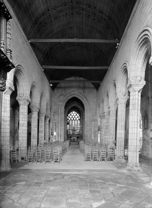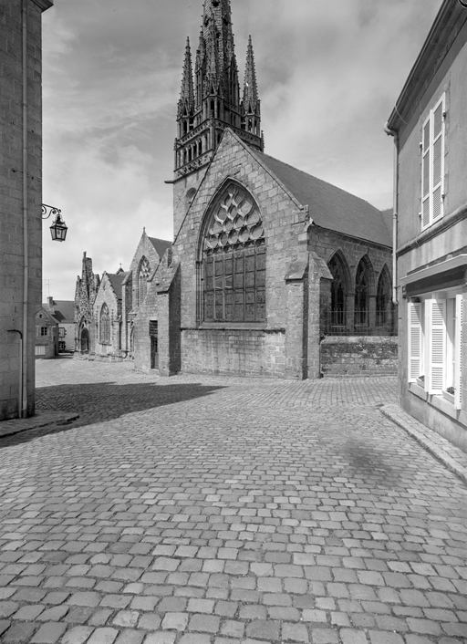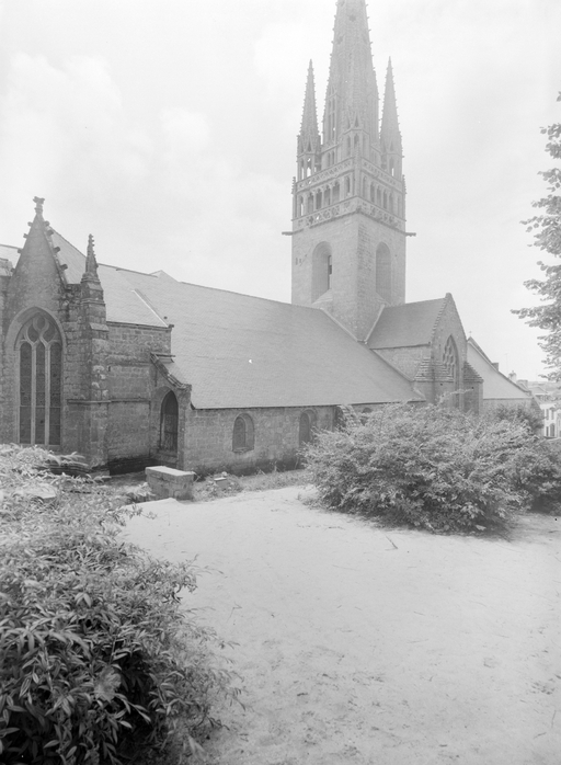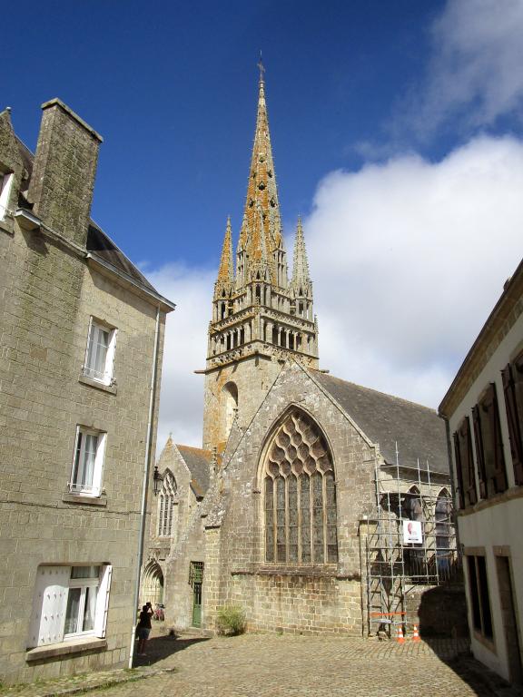 L´histoire de la construction, extrêmement complexe, pose de nombreux problèmes que R. Couffon, le premier, a tenté de résoudre en proposant un système chronologique, satisfaisant à certains égards, mais dont les phases initiales méritent un réexamen. Du moins a-t-il eu, après E. Lefèvre-Pontalis, le mérite de replacer dans le contexte de la création architecturale gothique un édifice trop longtemps rattaché à l´art roman. Il situe donc la construction de la nef, du transept (repris au 15e siècle) et des quatre premières travées du choeur dans les années centrales du 13e siècle, le modèle des bases superposant une plinthe, un quart-de-rond et un tore ne pouvant guère être antérieur. Une seconde campagne, à la fin du même siècle, aurait vu l´allongement du chevet de deux travées vers l´est et la construction au sud du choeur d´une grande chapelle en équerre, ultérieurement dédiée au Rosaire. On pourrait tout aussi valablement attribuer à Sinquin, et donc au dernier tiers du 13e siècle, sinon la construction entière, du moins l´achèvement de la partie la plus ancienne de l´église (nef et premières travées du choeur). L´extension du sanctuaire et l´érection de la chapelle sud qui en est sans doute contemporaine pourraient de ce fait être reportées dans le courant du 14e siècle. Pour faciliter l´accès à cette chapelle, on aurait alors supprimé le double bas-côté sud du chœur au profit d´un collatéral unique, et réutilisé ses arcades pour agrandir vers l´est le collatéral nord. Certes, le remplage de deux des baies qui éclairent la chapelle à l´est rappelle ceux de la chapelle de la Victoire de la cathédrale de Quimper, consacrée en 1295 ; mais cette similitude n´accrédite pas nécessairement la datation proposée par Couffon, elle fournit tout au plus un terminus a quo.