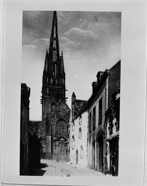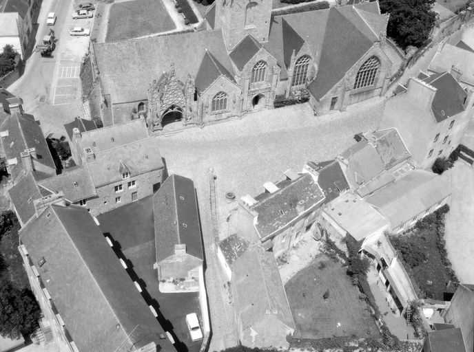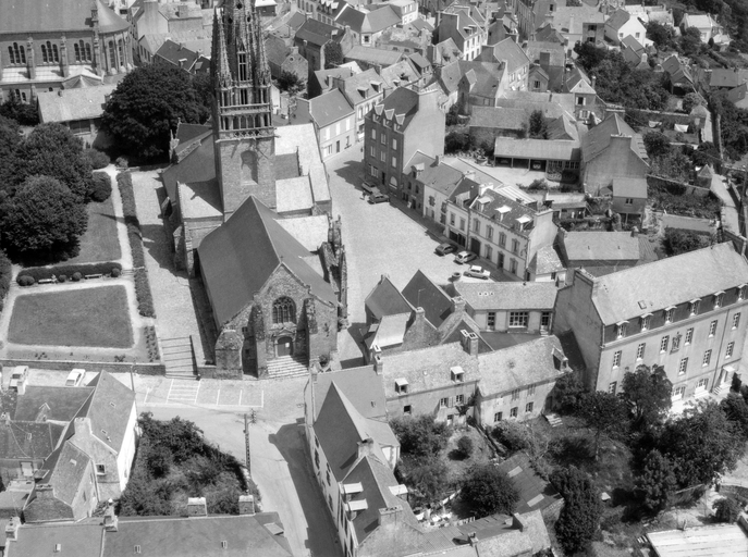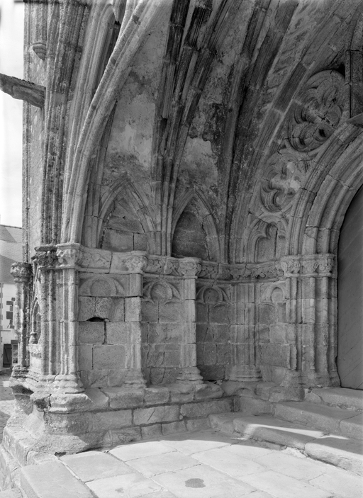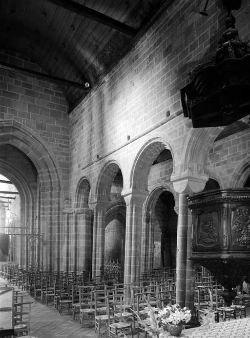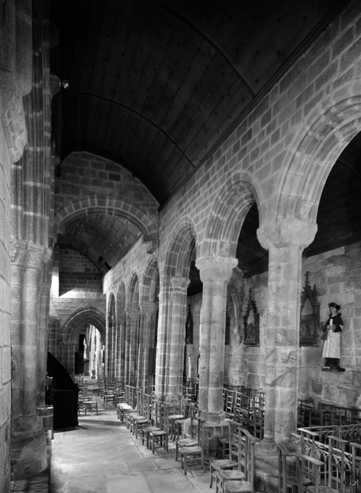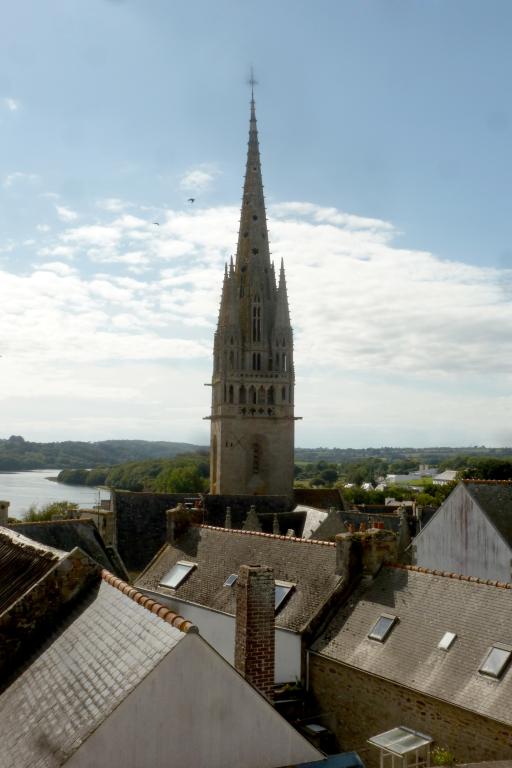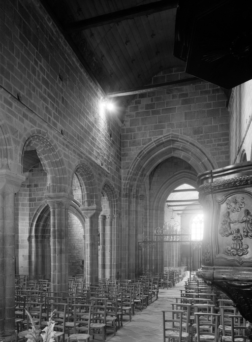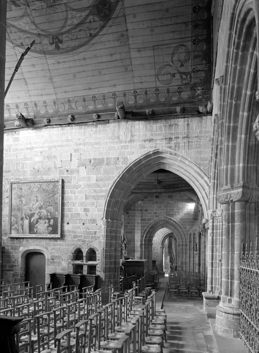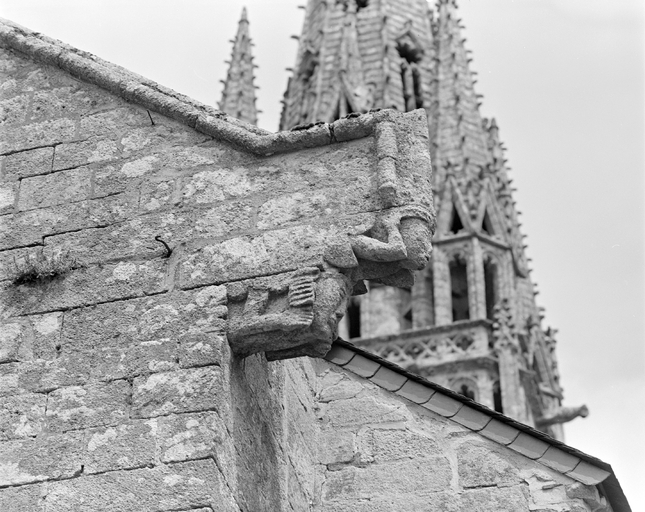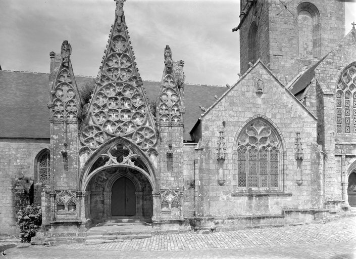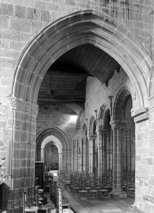L´histoire de la construction, extrêmement complexe, pose de nombreux problèmes que R. Couffon, le premier, a tenté de résoudre en proposant un système chronologique, satisfaisant à certains égards, mais dont les phases initiales méritent un réexamen. Du moins a-t-il eu, après E. Lefèvre-Pontalis, le mérite de replacer dans le contexte de la création architecturale gothique un édifice trop longtemps rattaché à l´art roman. Il situe donc la construction de la nef, du transept (repris au 15e siècle) et des quatre premières travées du choeur dans les années centrales du 13e siècle, le modèle des bases superposant une plinthe, un quart-de-rond et un tore ne pouvant guère être antérieur. Une seconde campagne, à la fin du même siècle, aurait vu l´allongement du chevet de deux travées vers l´est et la construction au sud du choeur d´une grande chapelle en équerre, ultérieurement dédiée au Rosaire. On pourrait tout aussi valablement attribuer à Sinquin, et donc au dernier tiers du 13e siècle, sinon la construction entière, du moins l´achèvement de la partie la plus ancienne de l´église (nef et premières travées du choeur). L´extension du sanctuaire et l´érection de la chapelle sud qui en est sans doute contemporaine pourraient de ce fait être reportées dans le courant du 14e siècle. Pour faciliter l´accès à cette chapelle, on aurait alors supprimé le double bas-côté sud du chœur au profit d´un collatéral unique, et réutilisé ses arcades pour agrandir vers l´est le collatéral nord. Certes, le remplage de deux des baies qui éclairent la chapelle à l´est rappelle ceux de la chapelle de la Victoire de la cathédrale de Quimper, consacrée en 1295 ; mais cette similitude n´accrédite pas nécessairement la datation proposée par Couffon, elle fournit tout au plus un terminus a quo.