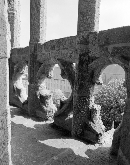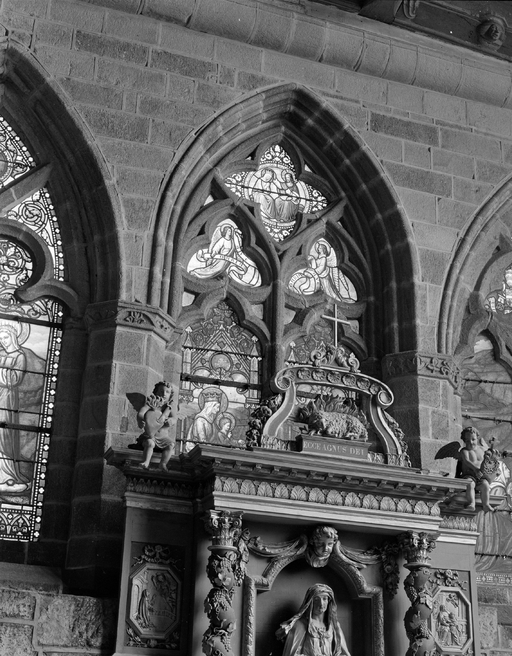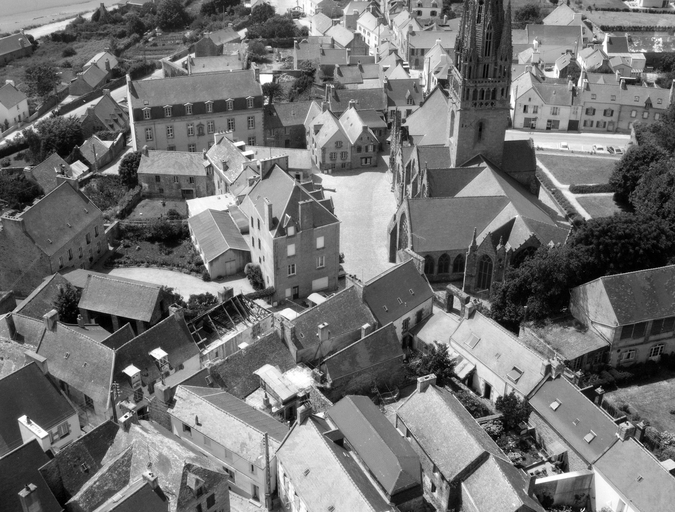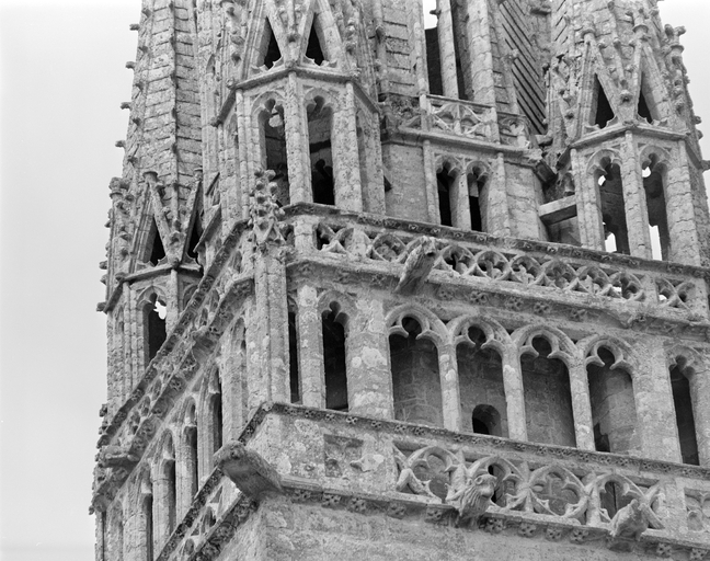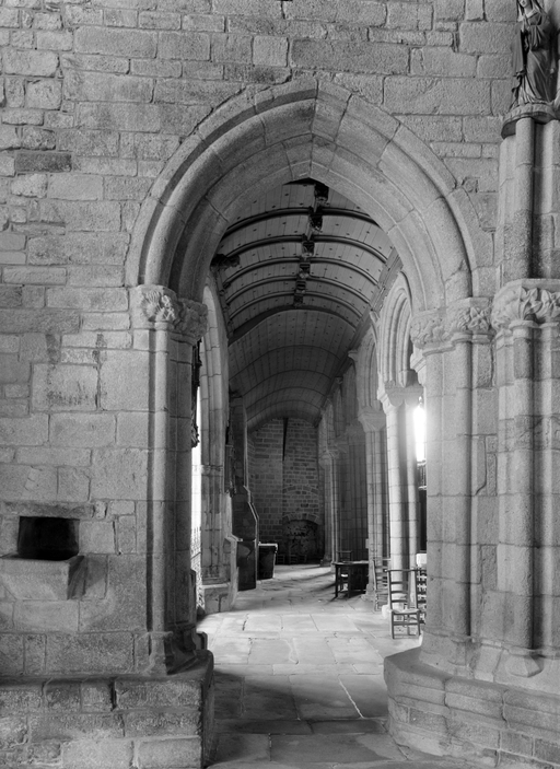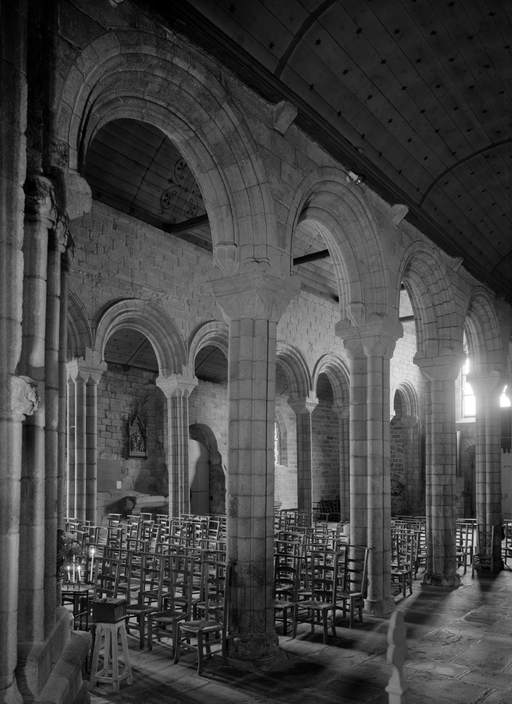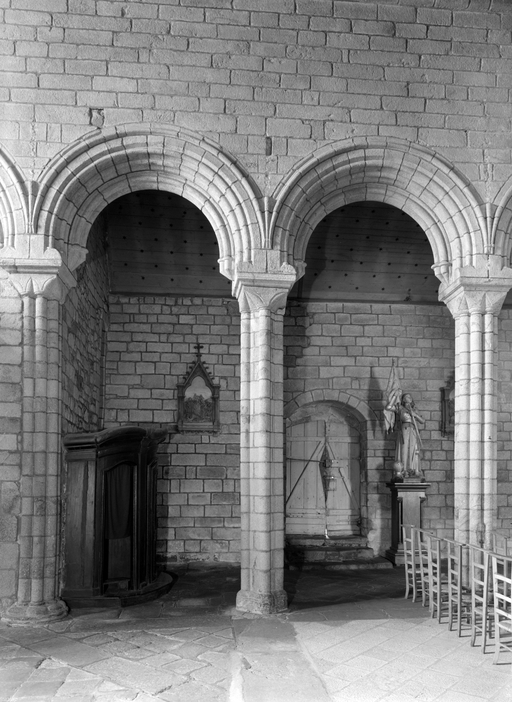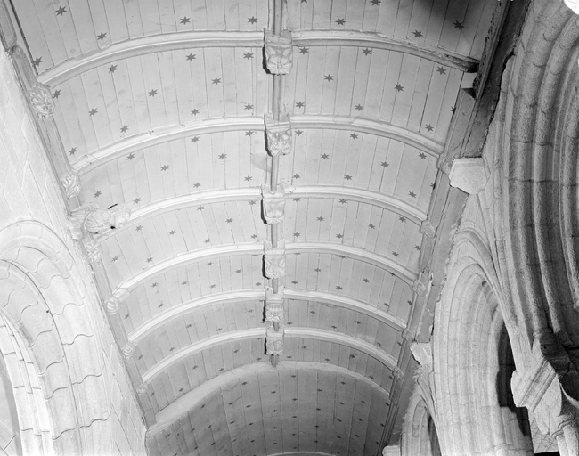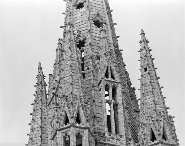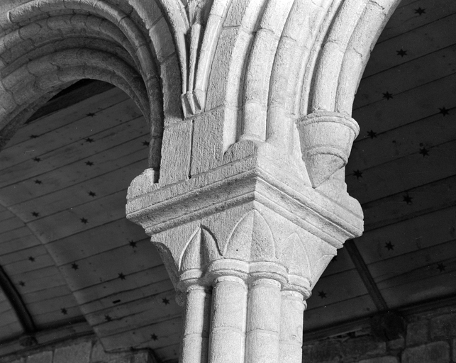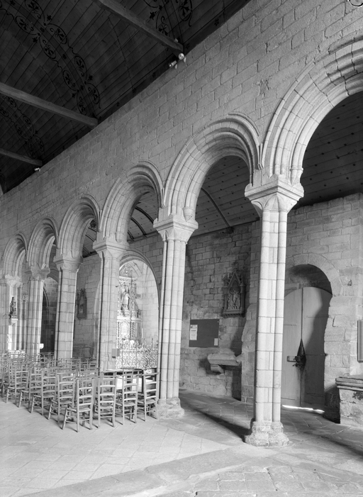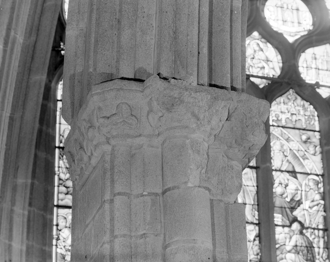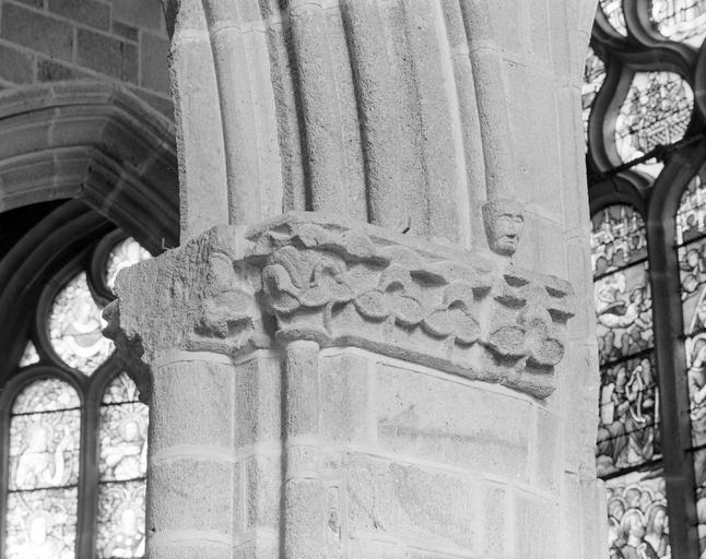 L´histoire de la construction, extrêmement complexe, pose de nombreux problèmes que R. Couffon, le premier, a tenté de résoudre en proposant un système chronologique, satisfaisant à certains égards, mais dont les phases initiales méritent un réexamen. Du moins a-t-il eu, après E. Lefèvre-Pontalis, le mérite de replacer dans le contexte de la création architecturale gothique un édifice trop longtemps rattaché à l´art roman. Il situe donc la construction de la nef, du transept (repris au 15e siècle) et des quatre premières travées du choeur dans les années centrales du 13e siècle, le modèle des bases superposant une plinthe, un quart-de-rond et un tore ne pouvant guère être antérieur. Une seconde campagne, à la fin du même siècle, aurait vu l´allongement du chevet de deux travées vers l´est et la construction au sud du choeur d´une grande chapelle en équerre, ultérieurement dédiée au Rosaire. On pourrait tout aussi valablement attribuer à Sinquin, et donc au dernier tiers du 13e siècle, sinon la construction entière, du moins l´achèvement de la partie la plus ancienne de l´église (nef et premières travées du choeur). L´extension du sanctuaire et l´érection de la chapelle sud qui en est sans doute contemporaine pourraient de ce fait être reportées dans le courant du 14e siècle. Pour faciliter l´accès à cette chapelle, on aurait alors supprimé le double bas-côté sud du chœur au profit d´un collatéral unique, et réutilisé ses arcades pour agrandir vers l´est le collatéral nord. Certes, le remplage de deux des baies qui éclairent la chapelle à l´est rappelle ceux de la chapelle de la Victoire de la cathédrale de Quimper, consacrée en 1295 ; mais cette similitude n´accrédite pas nécessairement la datation proposée par Couffon, elle fournit tout au plus un terminus a quo.