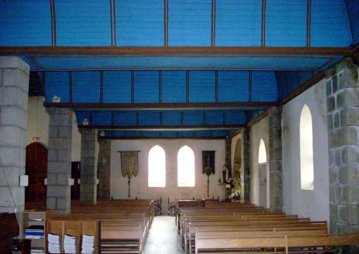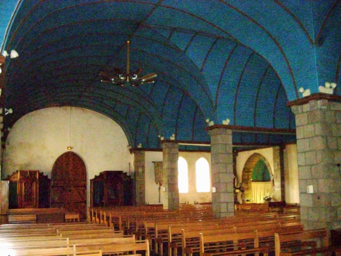 Édifice de plan irrégulier, à deux vaisseaux et à trois travées. Chœur peu profond à chevet plat. Clocher à chambre de cloches ajourée amortie d'une flèche octogonale ornée de crochets et encadrée à sa base par quatre gables ajourés et quatre pinacles. Gros œuvre en moellon de granite enduit de ciment blanc, à l´exception des encadrements des baies et des chaînages d´angle en pierre de taille de granite. Chapelle nord en quatre parties couvertes de charpentes indépendantes couvertes de lambris, portées sur les architraves reposant sur des piliers carrés. Chapelle des fonts baptismaux pentagonale au niveau de la première travée. Lambris de couvrement peint en bleu. Sol couvert de dalles de granite.