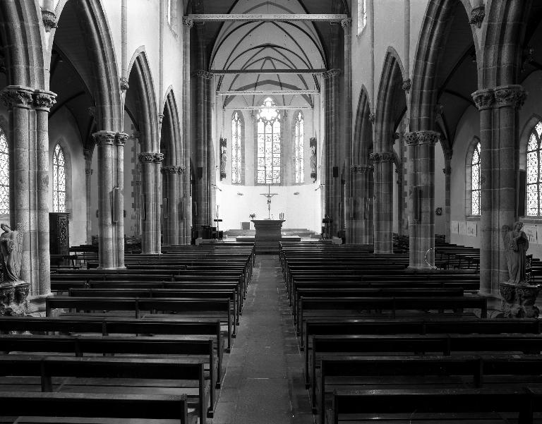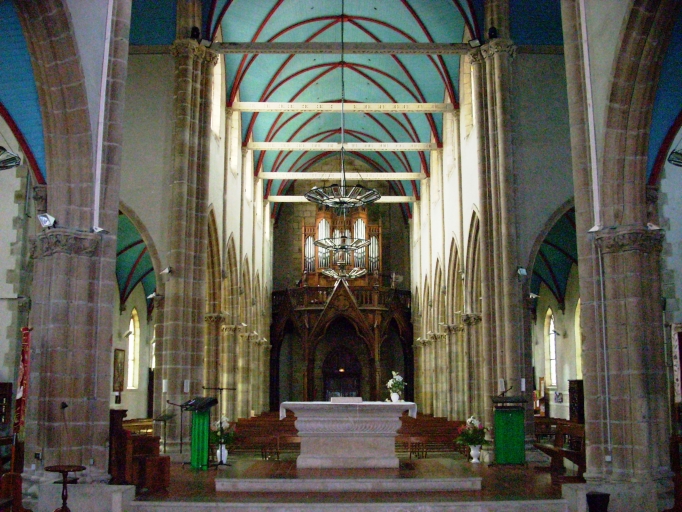 Nef à six travées, éclairée par des fenêtres hautes et couverte d´un lambris peint en bleu à nervures rouges et entraits blancs. Arcades en arc brisé reposant sur les chapiteaux des piliers à noyau carré cantonnés de colonnes. Chœur flanqué de deux chapelles ouvertes sur le transept. Massif occidental portant tribune. Sol couvert de dalles de granite.