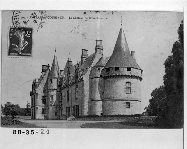 Au 11e siècle, Geoffroy Chaudeboeuf fait donation de la terre de Bonnefontaine à l'abbaye de Saint Florent de Saumur. Puis, au 13e siècle, Bonnefontaine entre dans la famille de Saint-Brice pendant trois générations. Jeanne de Saint-Brice, unique héritière de Bonnefontaine épouse en 1370 Guillaume de Porcon, fils d'Olivier de Porcon, compagnon de Bertrand du Guesclin. En 1488, Arthur de Porcon est Chambellan de la duchesse Anne de Bretagne et capitaine de Fougères. C’est à cette famille, propriétaire de la seigneurie de Bonnefontaine pendant deux siècles, que l’on doit la construction du château. En 1533, Françoise de Porcon épouse Pierre Giffard de La Marzelière. Pierre de La Marzelière, gentilhomme de la cour de François Ier, obtient du roi Henri II, le 5 juillet 1547, l'autorisation de transformer Bonnefontaine en place forte. C'est lui qui fera construire la partie sud du château, notamment la grosse tour à mâchicoulis. En 1604 la fille de François de La Marzelière hérite de Bonnefontaine, elle épouse en 1631 Malo de Coëtquen. A cette époque, les Coëtquen sont également seigneurs de Combourg et gouverneurs de Saint-Malo. En 1754 Bonnefontaine est vendu par Louise-Maclovie de Coëtquen, épouse d'Emmanuel de Durfort, duc de Duras. Bonnefontaine est acheté par Jean de La Motte, seigneur de Lesnage. La terre est vendue comme bien national en l'an VII.
