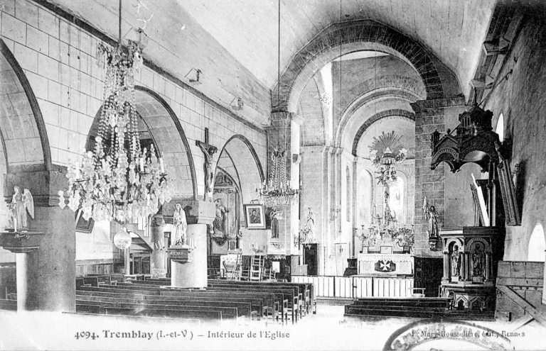 L'église de Tremblay fut donnée vers 1058 à l'abbaye Saint-Florent-en-Anjou qui y fonda un prieuré dans la seconde moitié du 11e siècle. De cette époque datent : l'abside et ses cinq fenêtres, les bras du transept aujourd'hui dépourvus de leur absidiole, la croisée avec sa tour et le mur sud de la nef. Au 15e siècle on refait la porte sud et son porche et l'élévation de la façade ouest doublée ultérieurement au 16e siècle lors de l'édification du collatéral nord. De cette époque date aussi la réfection de trois des arcades de la croisée qui portent les armoiries de la famille du Pontavice. Clocher incendié en 1795, probablement reconstruit en 1801 en même temps qu'une campagne de travaux à la façade ouest (date portée) . A la fin du 19e siècle reconstruction du pignon du bras sud et ajout d'une sacristie d'axe.