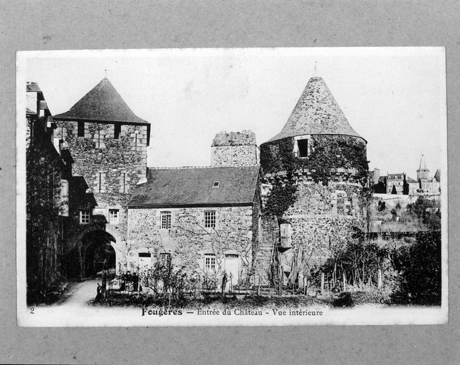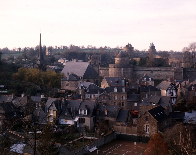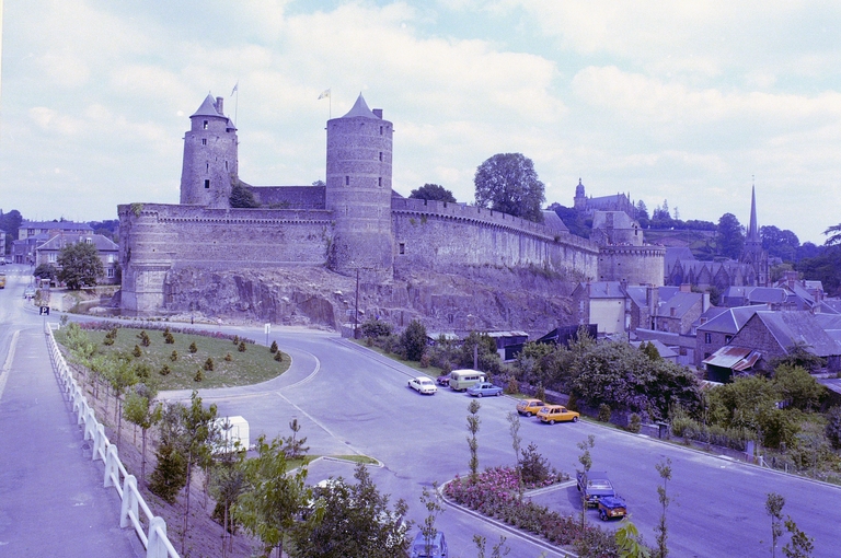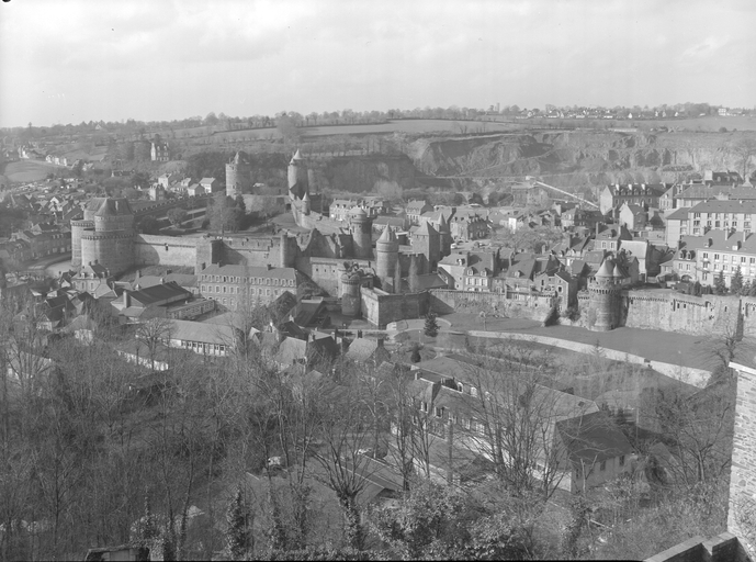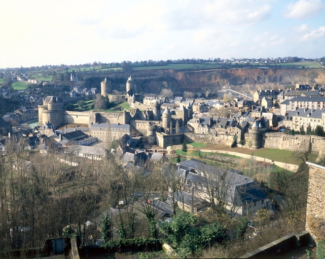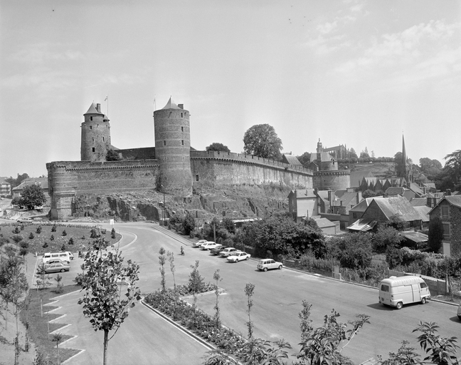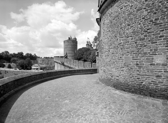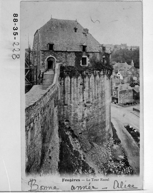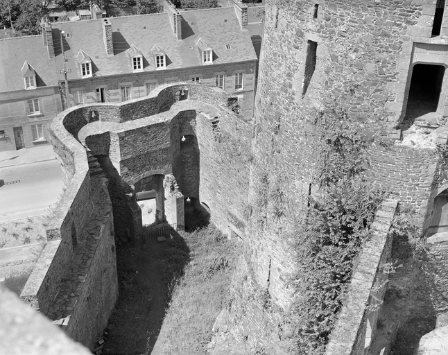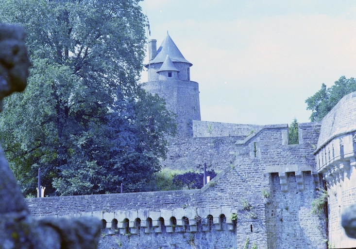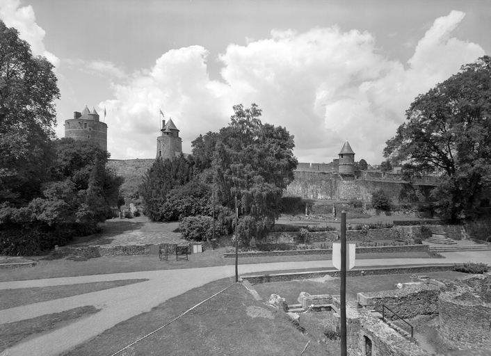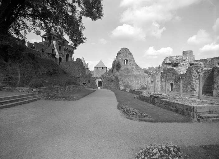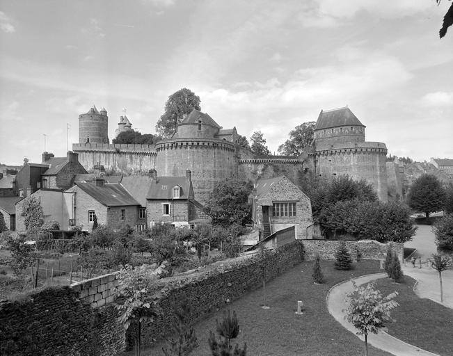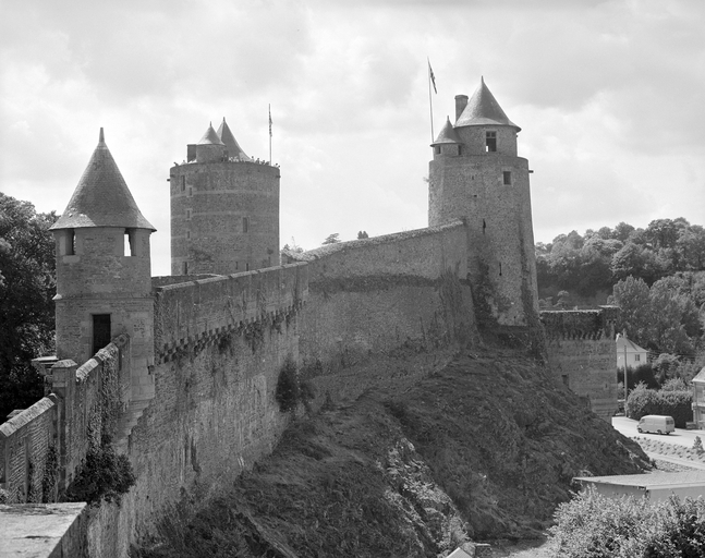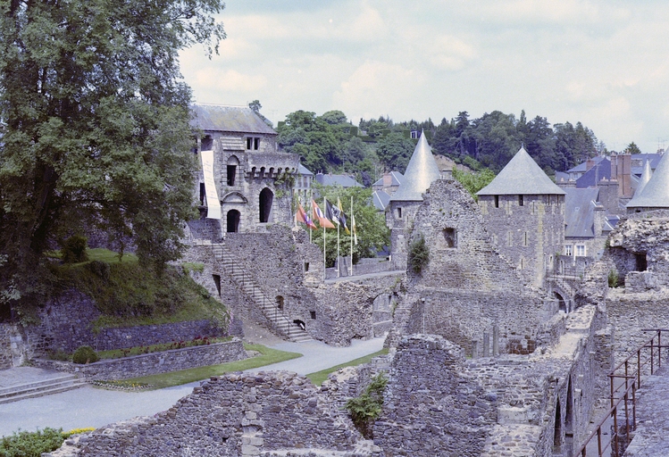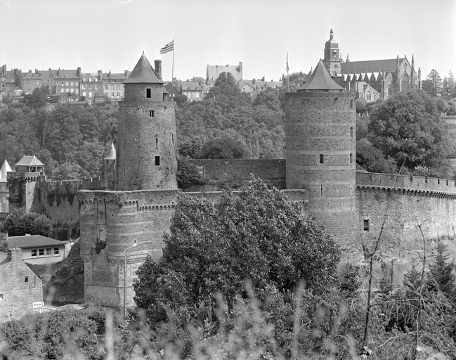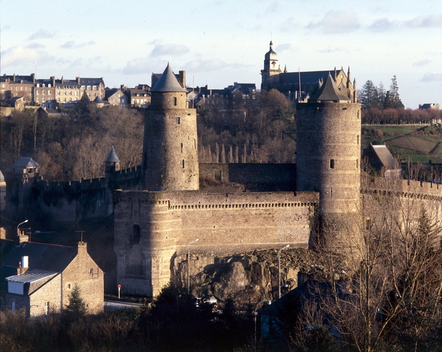 Château antérieur ruiné en 1166 ; reconstruit vers 1173 pour Raoul II (tours d'entrée, tour de Coigny) ; tour Mélusine 14e siècle ; tour du Gobelin remaniée 14e siècle ; tours d'Amboise 1ère moitié 15e siècle pour Pierre II ; tours Raoul et Surienne entre 1480 et 1485 ; logis 14e siècle détruit vers 1810, 1820 ; inscriptions modernes ; marques de tâcheron sur les tours Raoul et Surienne.