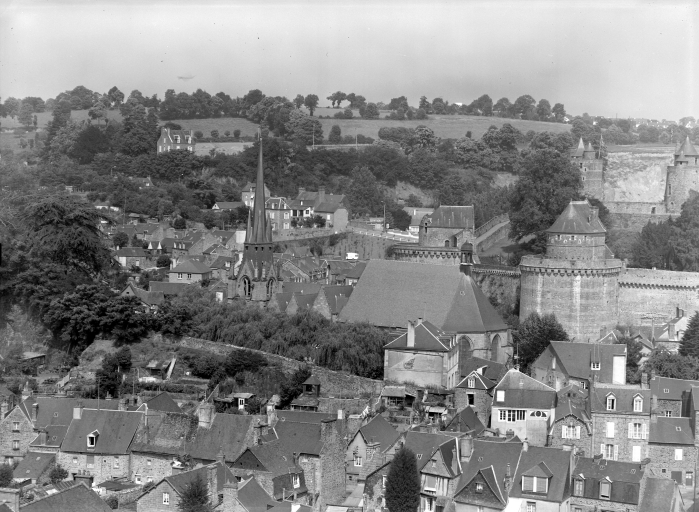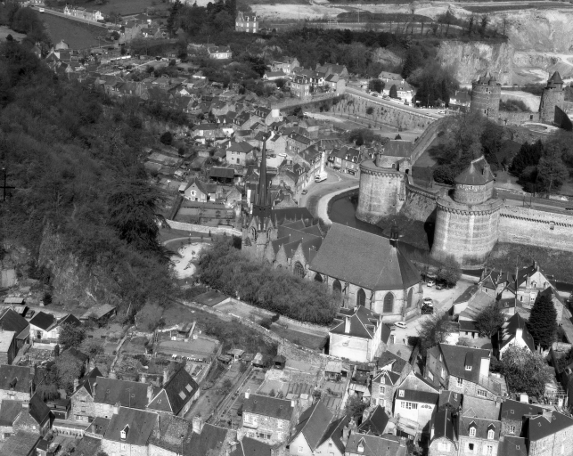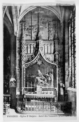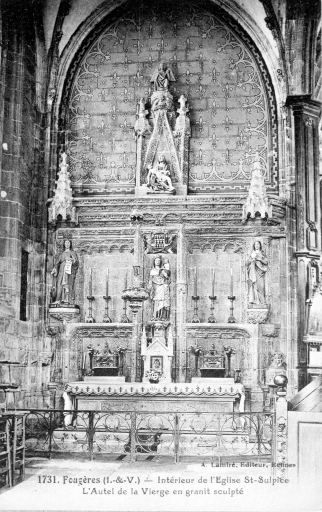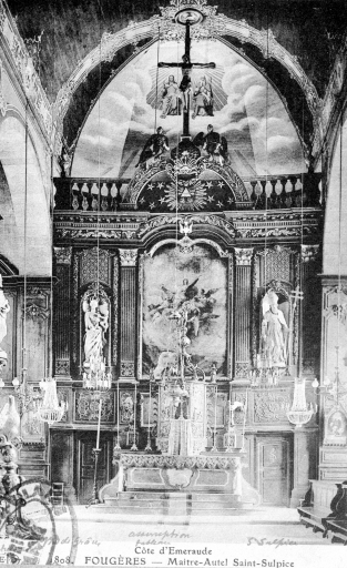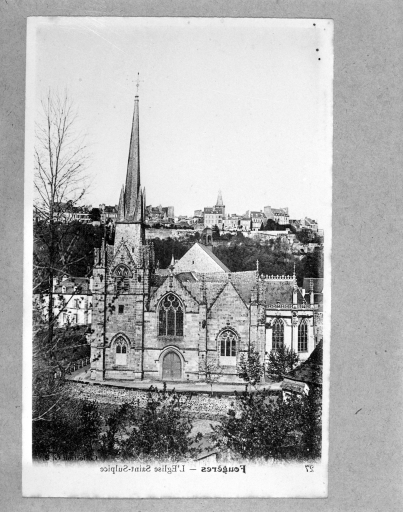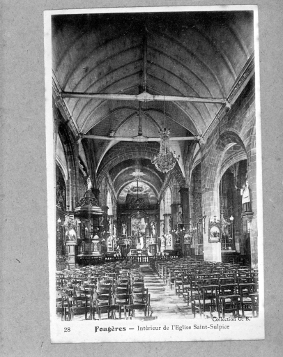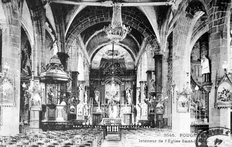 La 1ère église dédiée à saint Sulpice datait du 11e siècle. Elle avait été donnée en 1075 à l'abbaye de Marmoutiers par Adelaïde, veuve de Main II seigneur de Fougères. Cet édifice a été entièrement reconstruit (nef, collatéraux) à partir de la 2e moitié du 15e siècle jusqu'au 3e quart du 16e siècle : tour construite entre 1469 et 1490, 1er pignon du collatéral nord daté vers 1490, partie centrale de la façade occidentale vers 1530, arc diaphragme de 1522 (en 1562, les travaux du choeur sont interrompus, à la suite des ravages de la peste, le maître d'oeuvre se nommait alors Michel Thouroude) . La reprise du chantier sera à l'initiative de l'abbé Vallée, recteur de la paroisse à partir de 1729. Le gros-oeuvre du choeur est achevé vers 1760 (daté par travaux historiques) . Sa décoration et son mobilier sont l'oeuvre de nombreux artistes de la 2e moitié du 18e siècle, tels Thory, La Fontaine et Viollard. Les vitraux datés 1885 à 1926 sont l'oeuvre des peintres verriers parisiens : Lavergne et fils, A.M. Azure, Emile et Charles Tournel, Payan, Guyonnet, et du peintre verrier lavallois : Ludovic Alleaume.