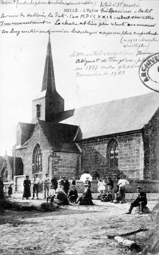Partie basse de la façade occidentale, nef et porche sud du 15e siècle. Choeur du 2e quart du 16e siècle, inscription et date 1529 sur une sablière à l'entrée du choeur. Sacristie et chapelle nord du 1er quart du 18e siècle avec inscription : FAIT FAIRE PAR MISSIRE PIERRE CLOUARD, RECTEUR DE MELLE 1711. Partie supérieure de la façade ouest reconstruite en 1781 (daté par travaux historiques) . Remaniements de détails au 19e siècle.