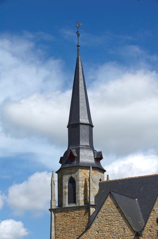 A l'ouest, elle présente une tour-clocher. Son portail est surmonté d'une accolade, les pierres du linteau sont assemblées en claveau. Au-dessus du portail se trouvent trois fenêtres ogivales. Il y a des contreforts courants le long de la tour carrée, aux quatre coins de la tour se trouvent des pinacles. Le clocher octogonal présente trois fenêtres dotées d’abat-sons en bois, elles se trouvent au nord, à l'ouest et au sud. L'encadrement d'une quatrième fenêtre existe à l'est mais elle est comblée par le faîte du toit. Le toit s'élance en flèche polygonale et est couvert d'ardoise.