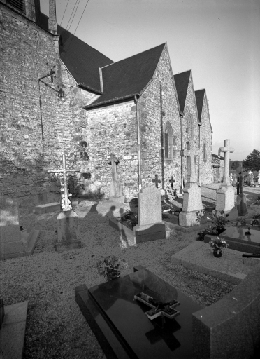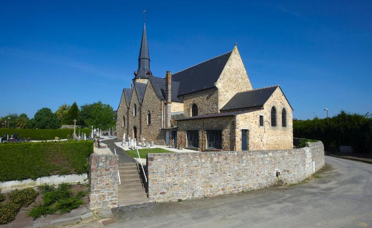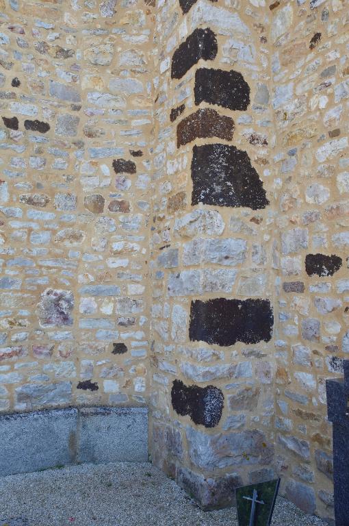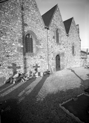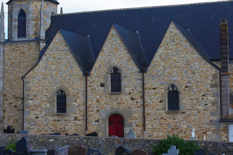 Dans l'angle, entre la tour-clocher et les pignons sud, se trouve une avancée qui correspond au mur sud de l'ancienne église.