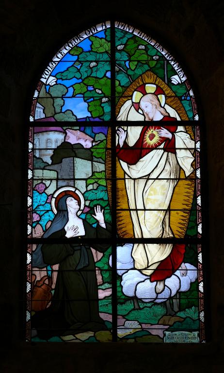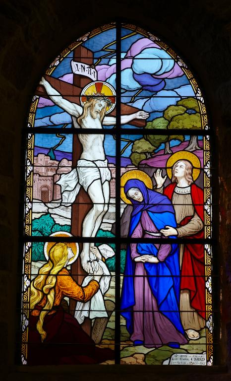À l'est, le pignon du chevet est aveugle et possède une croix sommitale. Ses murs nord et sud sont ouverts par une fenêtre en arc brisé. Ce sont ces deux fenêtres qui accueillent les vitraux peints par Alleaume. Le chevet se prolonge au nord par une sacristie dont le pignon est percé de quatre ouvertures : une porte, une petite fenêtre et deux belles fenêtres. On trouve enfin une chaufferie au sud-est du bâtiment qui abrite une cheminée récente.