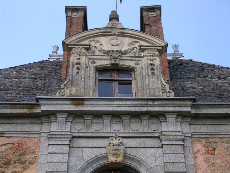 Sa façade antérieure est orientée au sud. Il s'agit d'un édifice de plan massé symétrique composé d'un corps de logis rectangulaire de trois travées flanquées de quatre tourelles polygonales sur les angles. Il comporte un étage de soubassement desservant les services (cour à l'ouest), un rez-de-chaussée surélevé, un étage carré et un étage de comble. Les élévations à travées sont ordonnancées sur quatre niveaux pour chaque élévation. En façade antérieure, se détache un avant-corps axial précédé d'un escalier à une volée double à montées convergentes. La maçonnerie est enduite d'un faux appareil losangé, le soubassement, le bandeau du premier étage, la corniche, les lucarnes, les encadrements de baies et les chaînes d'angle sont en pierre de taille de granite.