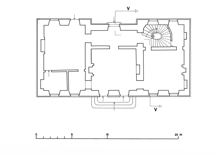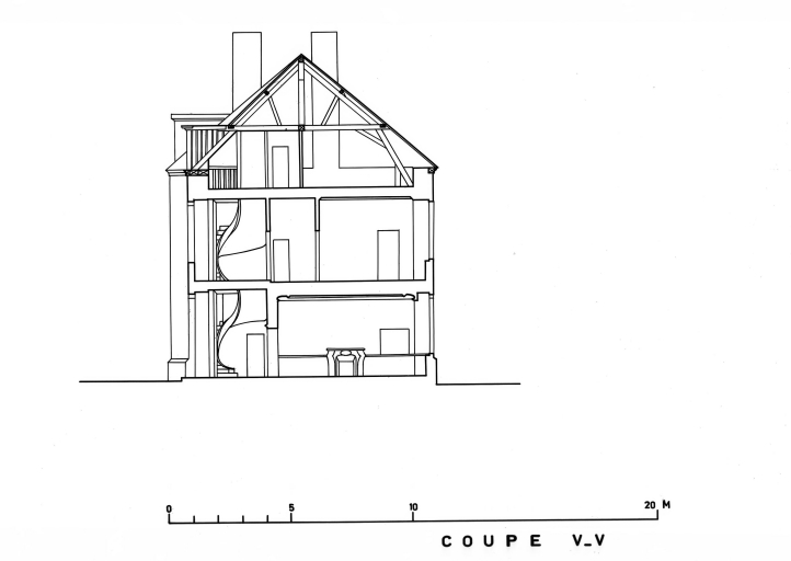 « Un grand corps de logis couvert d’ardoises avec cuisine et cabinet ou office à côté, salon et autre cabinet à côté, le tout au rez-de-chaussée ; cave sous la cuisine ; un corridor en rentrant au bout duquel est l’escalier avec une rampe en fer qui conduit au 1er étage, aux mansardes et au grenier. Au premier étage sont deux grandes chambres et deux autres petites, le tout avec cheminée ; deux autres petits cabinets de toilette ou garde-robe, le tout au couchant ; deux autres cabinets sans cheminée au levant, un corridor répondant à celui d’en bas au bout nord duquel sont les latrines et au midy, deux autres petits cabinets dont un avec cheminée, tous lesquels appartements sont très proprement boisés et ont des armoires et buffets d’attache de la plus grande commodité ; au-dessus desdites chambres sont quatre mansardes dont deux avec cheminée sur tout quoi sont les greniers. Contenant : 32 pieds de large sur 66 de long, le grand jardin et grande cour devant, le tout muré. Dans ladite cour au nord, sont une petite maison habitée par le fermier Breion, cellier et étable à côté. De suite, vers le levant, plusieurs autres bâtiments en pierre en appentis et couverts d’essentes ; au midy, dans la même cour, sont le puits, un four et un fournil en pierre, une écurie en terrasse et colombage et trois autres petits appartements en pierre au levant de la même cour, le tout couvert d’essentes ; en dehors de la même cour et au levant, est une grange belle et spacieuse en terre et colombage devant laquelle est l’aire, au côté nord du jardin est un verger bien planté et en bons pommiers, lequel pourpris contient par fonds dans sa totalité environ trois journaux… ».