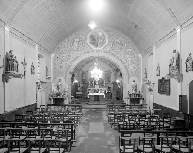 Plan allongé, nef terminée par un arc diaphragme, lambris de couvrement, clocher-porche, chevet plat. A signaler le décor peint consacré à l'iconographie de Saint-Martin.