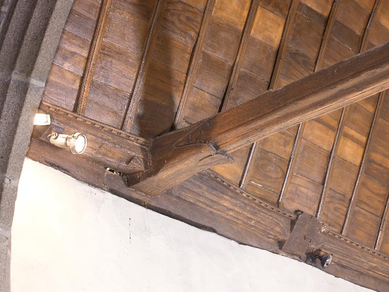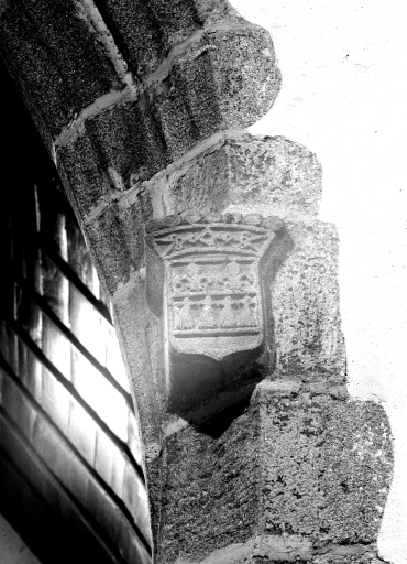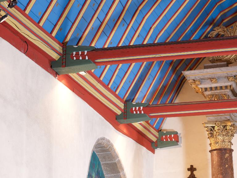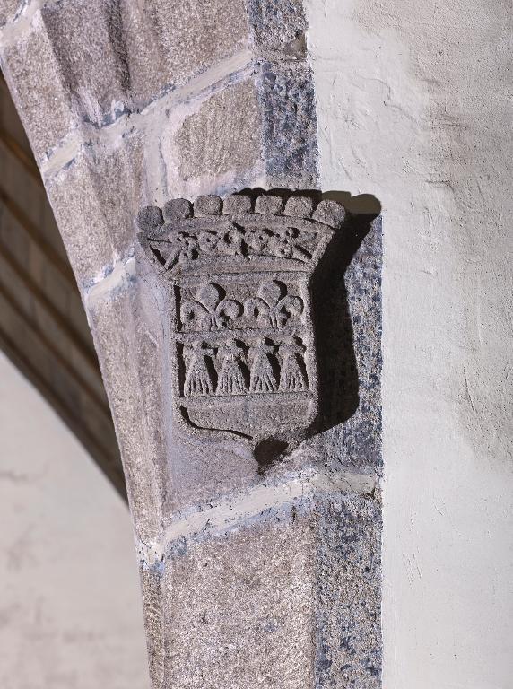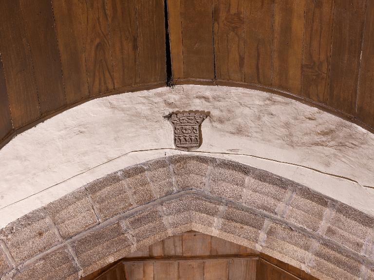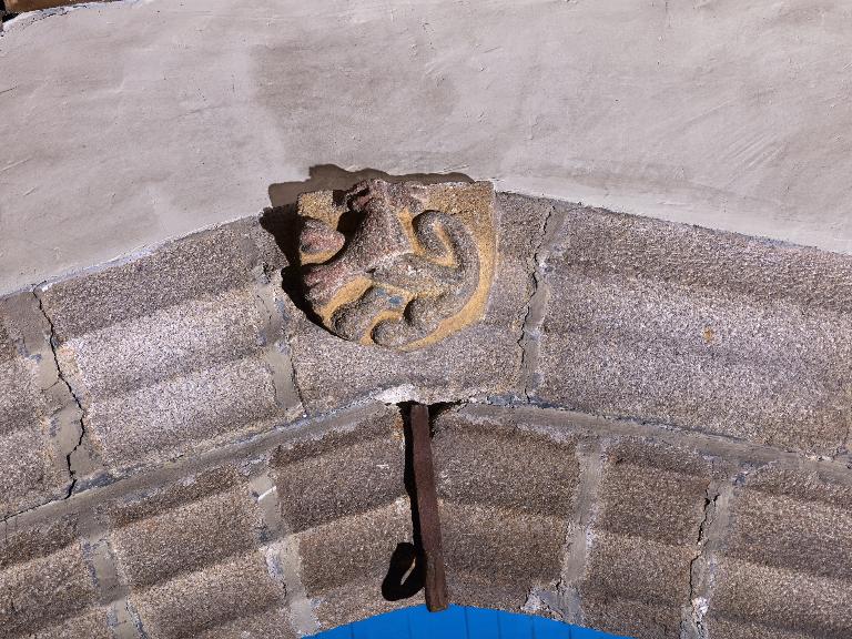 Sujet : instruments de la Passion avec coeur, support : porte du transept sud ; sujet : animal fantastique, support : acrotères et engoulants de la charpente ; sujet : armoiries des lys, de gueules à la fasce d'argent, chargée de 4 hermines de sable et surmontée de 2 fleurs de lys d'argent, support : piles de la croisée du transept.