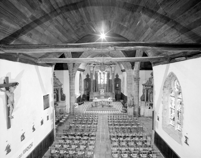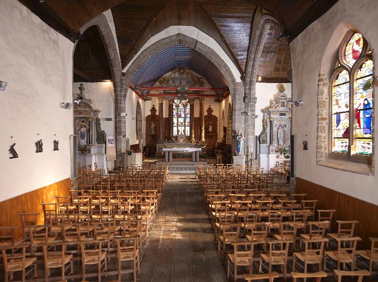 Plan en croix latine, lambris de couvrement, clocher en bas de la nef, chevet plat. Portes sculptées des entrées latérales à signaler. Sablières sculptées, entraits à engoulants.