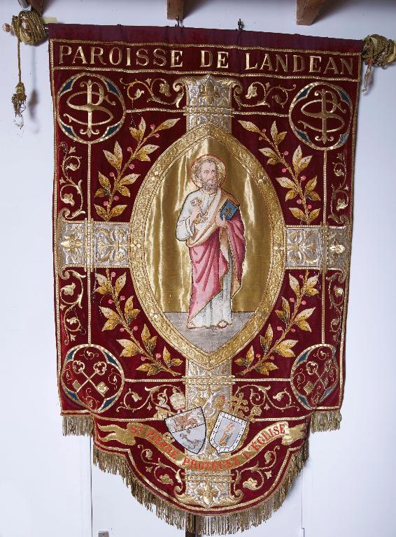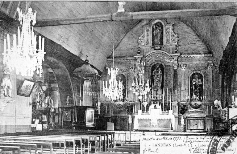 Cette église prieurale mentionnée dès le 12e siècle dépend à cette époque de l'abbaye de Saint-Pierre-de-Rillé. Dédiée à saint Pierre, représenté dans le chœur par la statue du saint avec les clefs et le coq, et à saint Paul, figuré avec le glaive ; on y trouve des vestiges de l'architecture de toutes les époques, depuis le style roman dans la nef jusqu'à l'ogival flamboyant. Le massif occidental est édifié au 15e siècle, tandis que le transept date du siècle suivant. La nef est couverte d'une charpente. L'édifice primitif se compose d'une seule nef à chevet droit ; au sud de cette nef est une fenêtre flamboyante, et au nord une fenêtre ogivale trilobée ; au bas, le portail en ogive, avec colonnettes et tympan gothique, était surmonté jadis d'un campanile, remplacé en 1826 par un clocher. En 1833, on releva le chevet et l'on ajouta deux chapelles, de façon à donner la forme d'une croix à tout l'édifice. On voyait en 1781 dans cette église les autels du Rosaire et de Saint-Sébastien ; la confrérie du Rosaire y fut établie, en effet, dès le 2 mai 1653. L'ancien autel majeur était de 1669, mais le prieur M. Bordier en fit construire un nouveau en 1771. Les fondations desservies en ce temple valaient 70 livres en 1790. Le roi, en qualité de baron de Fougères, avait les droits de supériorité dans l'église de Landéan, mais le seigneur du Hallay y jouissait des droits de seigneur fondateur et prééminencier, ayant son banc, son enfeu et ses armoiries dans le choeur. Le seigneur d'Ardennes, en Saint-Georges-de-Reintembault, possédait aussi quelques prééminences, ainsi que le seigneur de l'Artoire. Ce dernier avait son banc et son enfeu prohibitif, avec ses armoiries, devant l'autel de Notre-Dame et Saint-Gorgon.