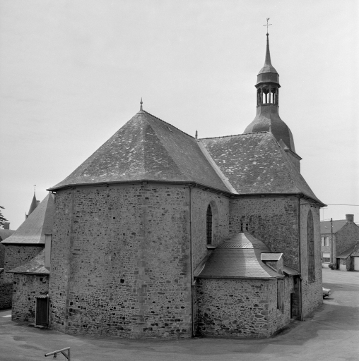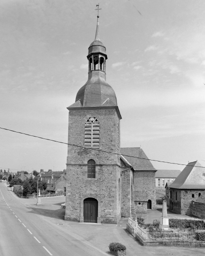 Vestiges de l'ancienne église romane dans le mur nord de la nef. Edifice actuel commencé en 1688. Clocher-porche achevé en 1713 et reconstruit en 1830 (daté par travaux historiques) . Deux verrières datées et signées : DENIS NANTES 1869.