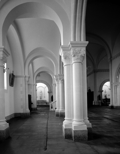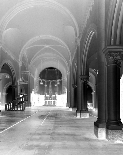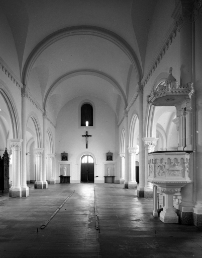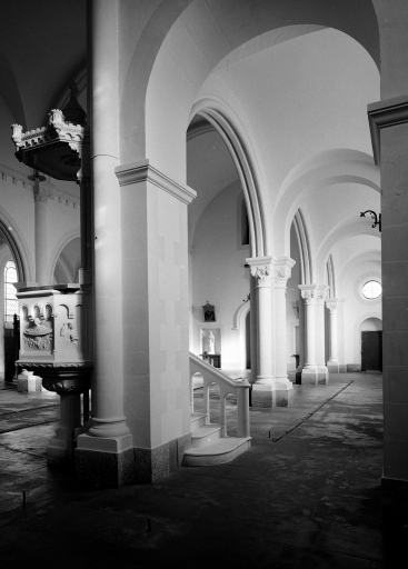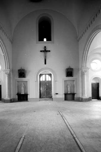 Plan en croix latine, clocher en façade, chevet arrondi, style néo-roman.