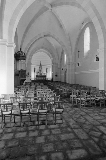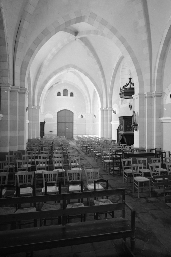 Plan allongé, voûte d'ogives, campanile en façade, chevet arrondi, style néo-roman.