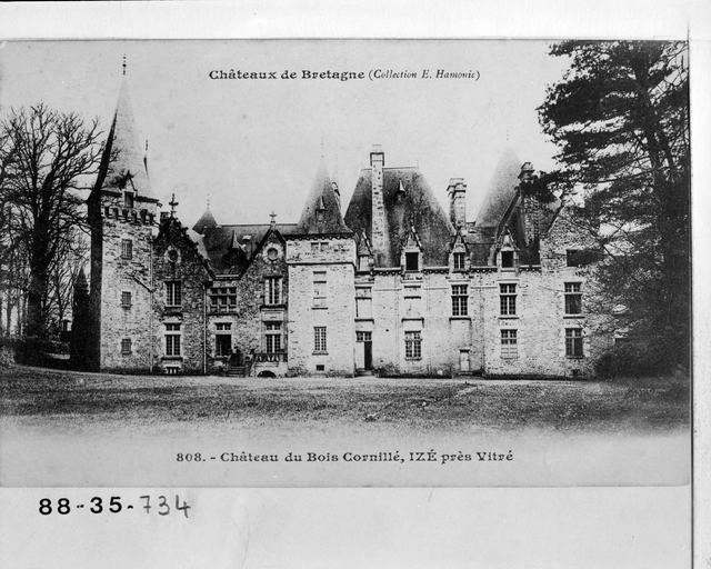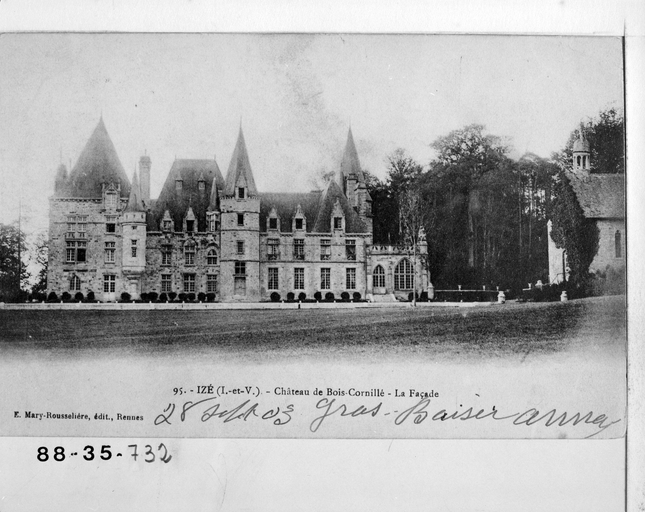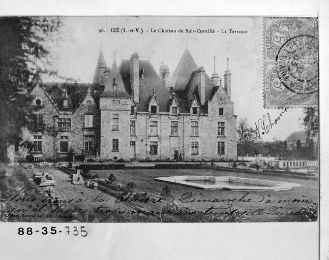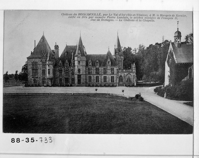Château du Bois-Cornillé et sa chapelle (cad. L 19) : inscription par arrêté du 29 août 1988 - Parc, dans la limite des parcelles AE 1 à 40 et 75 à 115 compris, L1 9 à 51, avec notamment le pavillon et l' allée d' accès, l' allée de ceinture, le jardin à la française, les façades et toitures de l' orangerie et du pavillon du jardinier, l' allée de lauriers, l' étang muré, le rond-point avec ses perspectives (cad. AE 1 à 40, 75 à 115 ; L1 9 à 51) : inscription par arrêté du 24 décembre 1992.
