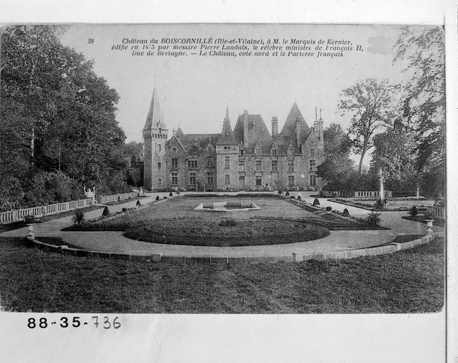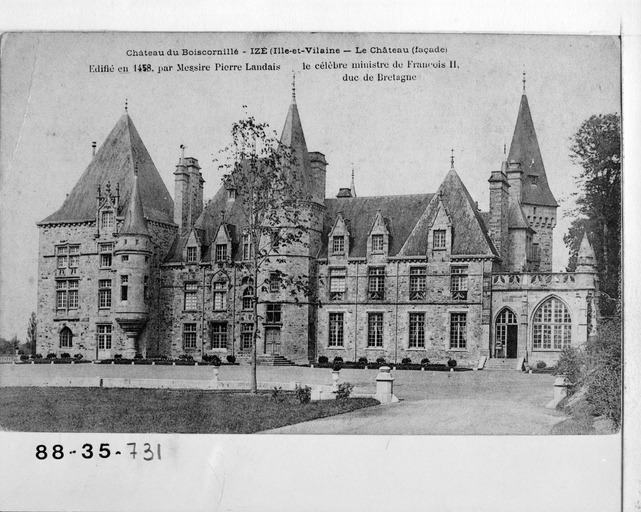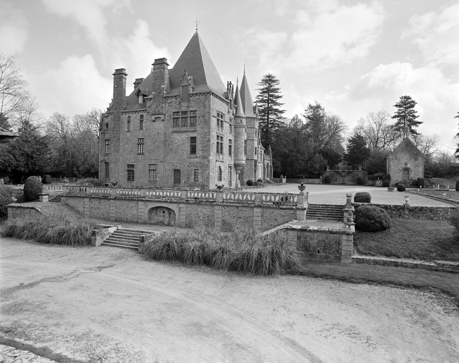 Edifié en 1458 par messire Pierre Landais, grand argentier du duc François II, le logis est reconstruit au 18e siècle. Acquis par la famille de Kernier en 1832, le château est fortement restauré au 19e siècle. Des travaux historiques mentionnent une restauration par Jacques Mellet en 1861. L'édifice est remodelé de 1883 à 1887 par les architectes Jules et Henri Mellet. Chapelle de 1721 remaniée en 1903. Anciens communs du 18e siècle à l'ouest réduits et transformés en orangerie et logement du jardinier. Le parc à l'anglaise est réalisé par Denis Bülher en 1876 ; le jardin classique d'un demi hectare, joustant le château au nord, est conçu en 1902 par Edouard André, pour Jacques de Kernier. Porte de l'ancienne Prison (Richelot) de Rennes, rue de Fougères (à l'époque), remontée comme fabrique dans le parc.