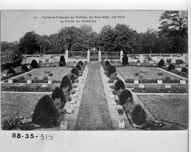 L'ancien Bois-Bide, construction du milieu du 17e siècle, appartient à la fin du 18e siècle à la famille du Bourg et passe par alliance aux du Pontavice en 1830. A la fin du 19e siècle, Auguste du Pontavice entreprend la reconstruction du manoir familial. Les premiers travaux (1883-1885) sont ceux de la construction du pavillon nord, dit " pavillon de Flore ". Pendant l'exécution de ces travaux, l'architecte angevin Auguste Beignet fournit deux projets, l'un pour la restauration de la partie ancienne du château, l'autre pour la construction d'un pavillon avec chapelle. Aucune source ne mentionne les circonstances de l'abandon de ces projets, mais une dizaine d'années s'écoule avant qu'Auguste du Pontavice ne reprenne les transformations de sa demeure ; il note simplement : " un intérim dans les constructions survint alors pendant lequel divers travaux d'embellissement furent néanmoins exécutés, entre autres : le Quinconce, au haut du jardin français, en 1890 ; le bâtiment de servitudes au bas du parc 1891 ; la reconstruction et transfert de la ferme du Bois-Bide actuelle 1894. Enfin le corps de logis fut mis en chantier en 1895 et terminé en 1897 " . Les travaux se poursuivent entre 1898 et 1914 par l'aménagement des abords du château, du parc, des communs et des installations intérieures. La ferme située à l'angle de l'ancienne aile sud de communs et la chapelle sont détruites, la cour devant le château est nivelée. Au début des années 1910, les plans du parc sont fournis par l'architecte paysagiste Nivet. Ces aménagements sont interrompus par la guerre pour reprendre très activement à partir de 1920. La dernière phase de travaux est lancée en 1929 avec la construction de la place " Kernier " qui marque l'entrée actuelle du château à l'est, l'achèvement du pavillon sud abritant le grand salon décoré par le peintre Jobbé-Duval entre 1929 et 1930, la chapelle et la construction d'une conciergerie sur la route de Pocé. Orangerie et portail de ferronnerie ouest du 18e siècle.
