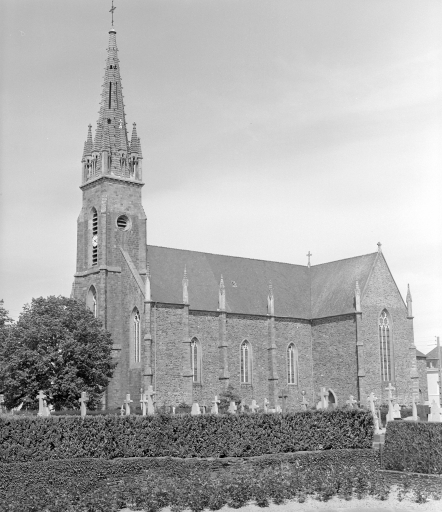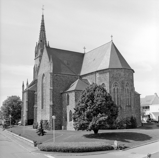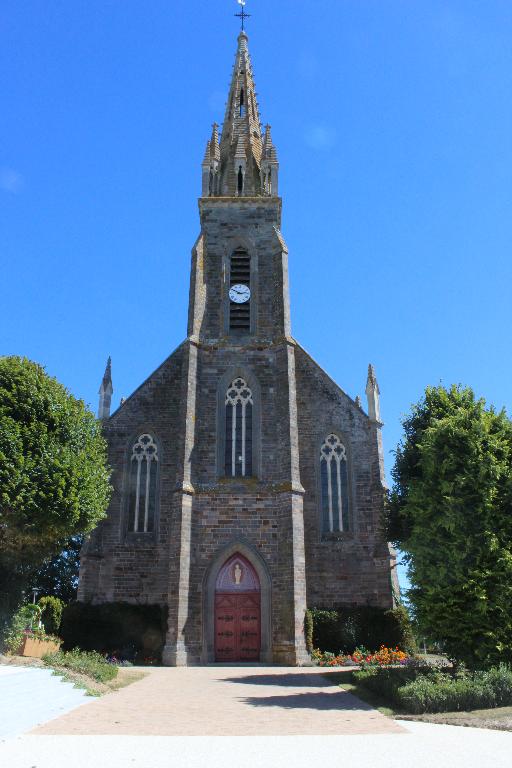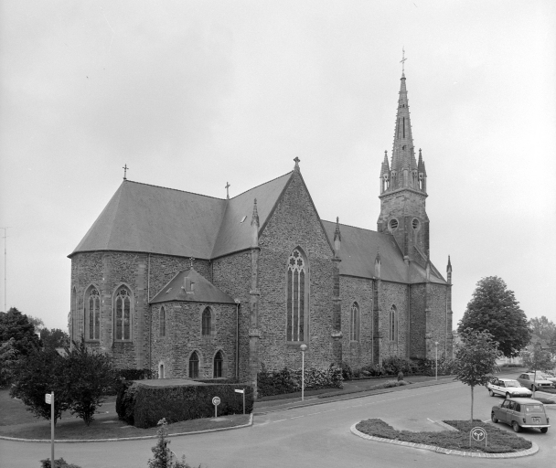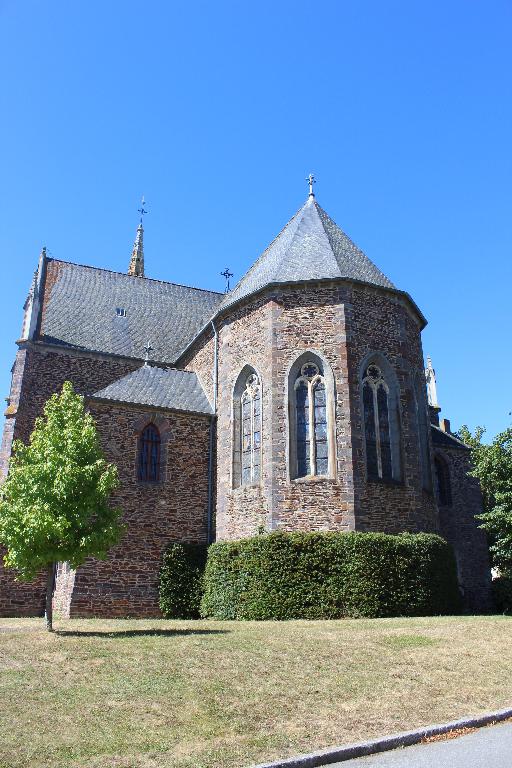 L'église, de style néo-gothique, présente un plan en croix latine à trois travées avec deux chapelles rectangulaires au niveau des bras du transept. C'est un édifice dans sa majeure partie construit en moellon de schiste et de grès tandis que la façade est construite en pierre de taille de Pont-Réan. Son toit à longs pans est couvert d'ardoises d'Anjou. La façade principale, en pierre de taille, est divisée en trois travées délimitées aux extrémités par des contreforts et au centre par les contreforts du clocher. L'avant-nef est éclairée par deux fenêtres dont l'encadrement est en granite. Elles se composent de trois lancettes et de trois quadrilobes, le tout en tuffeau. L'entrée se fait par la travée centrale qui n'est autre que la tour du clocher. Cette tour comporte quatre niveaux tous délimités par des bandeaux. Le premier niveau est réservé à la porte d'entrée, le second à la grande baie en granite et tuffeau, le troisième niveau se compose des abat-sons et enfin le dernier niveau n'est autre que le clocher à pinacles en tuffeau. La porte d'entrée est en arc brisé dont l'encadrement est en granit. Au-dessus de cette porte se trouve une statuette de Saint-Marc ainsi qu'un triangle qui symbolise la "Sainte-Trinité". Les trois travées de la nef sont délimitées par des contreforts en pierre de taille surmontés de pinacles en tuffeau. Chacune d'entre elle (pas sur qu'on comprenne qu'on parle des travées) est éclairée par une fenêtre dont l'encadrement en arc brisé en granite contient deux lancettes et un quadrilobe en tuffeau. Chaque bras du transept saillant est accessible par une porte en arc brisé en granit. Ce transept est éclairé par deux grandes verrières en granite et tuffeau. Une chapelle de plan rectangulaire prend place à chaque bras du transept. Le chevet est quant à lui à cinq pans chacun éclairé par une baie.
