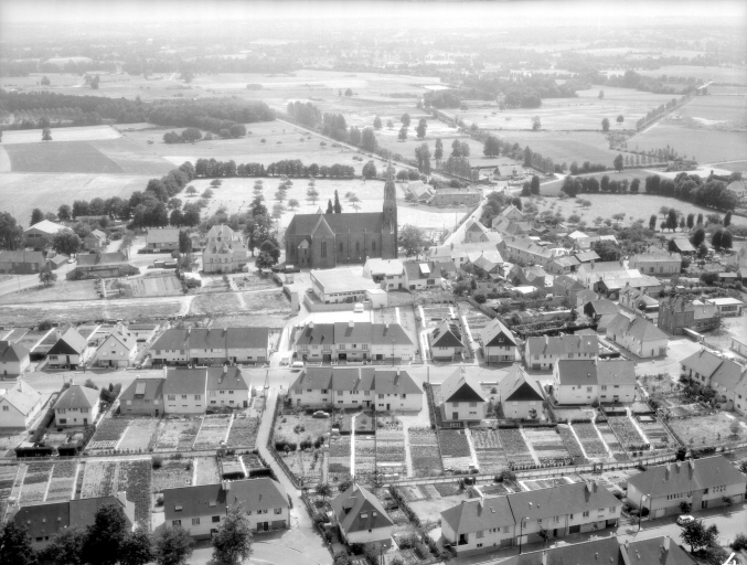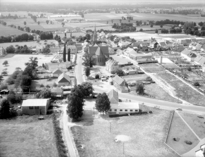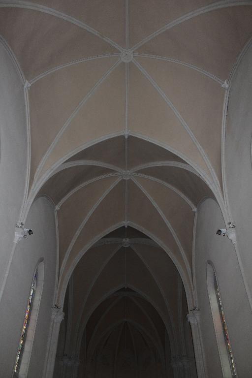 Plan en croix latine, voûte d'ogives, clocher-porche, chevet arrondi, style néogothique.