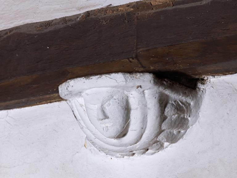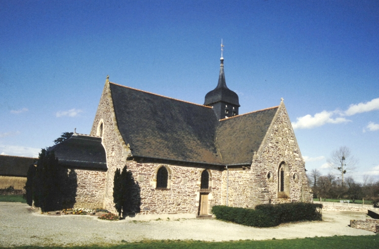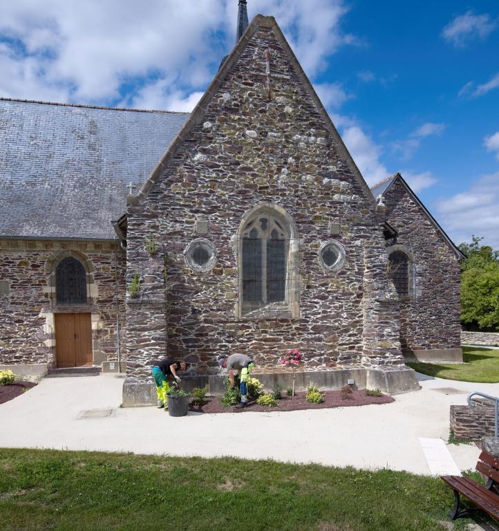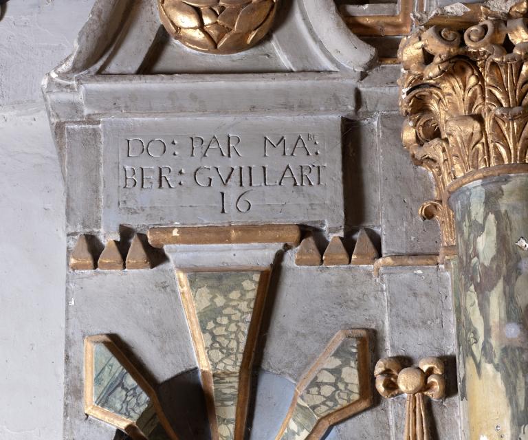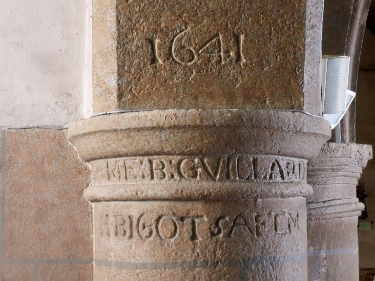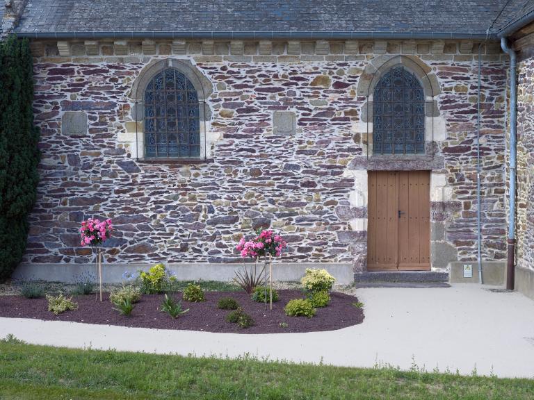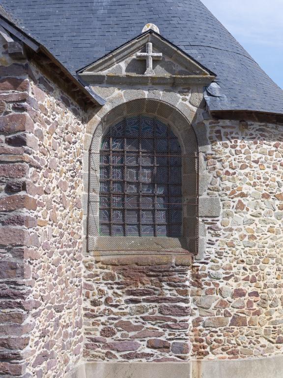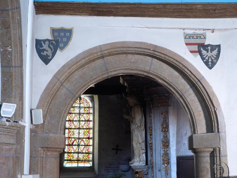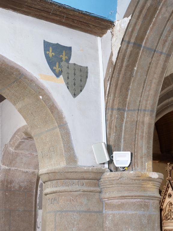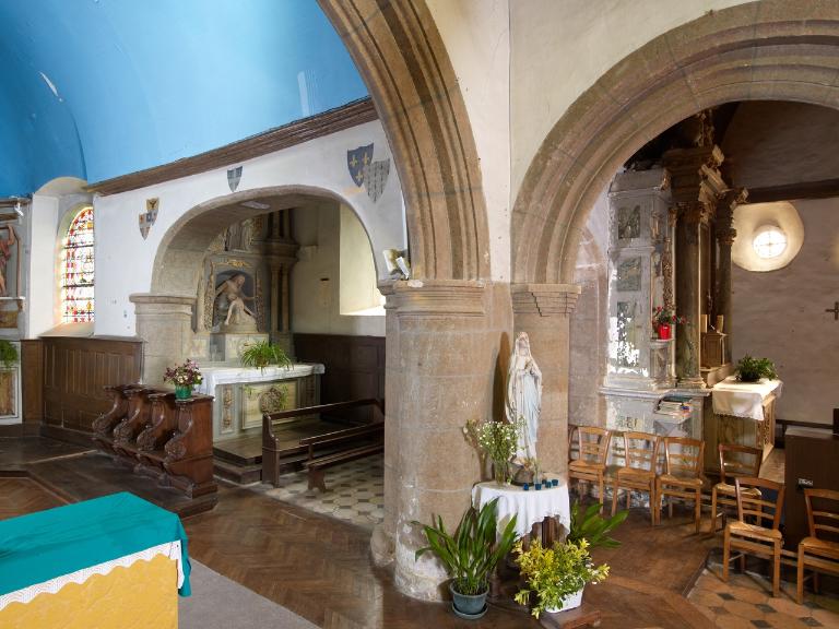 Le chœur communique avec la chapelle sud par un arc surbaissé sur lequel est visible les armoiries de la famille Huchet, et dont l'un des supports présente une inscription portant la date de 1641.