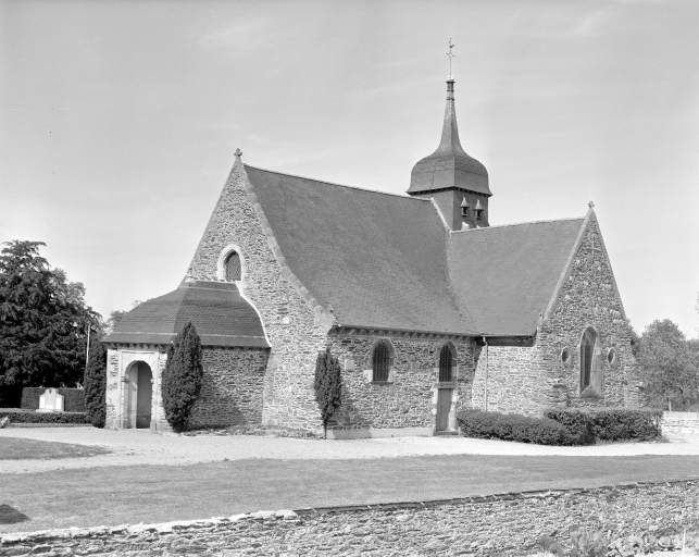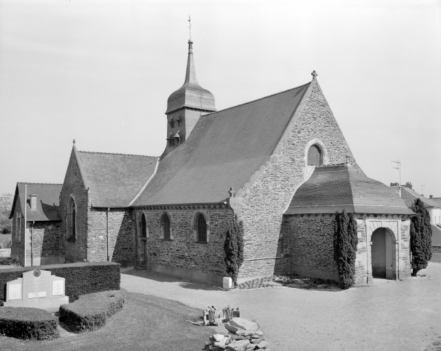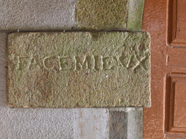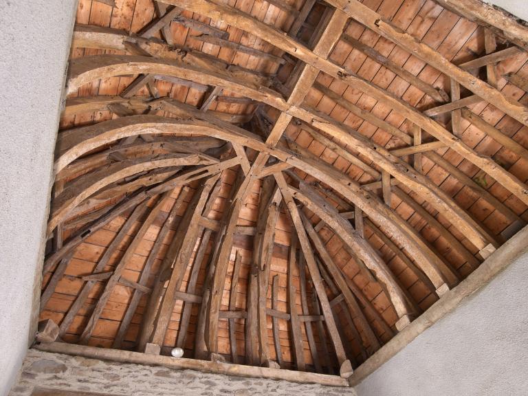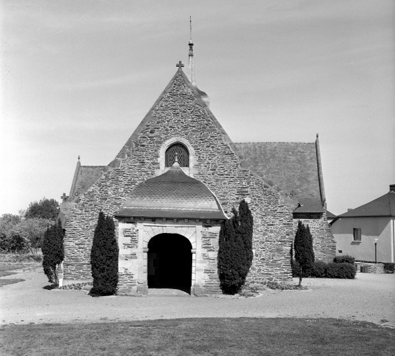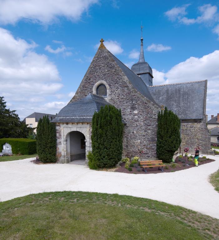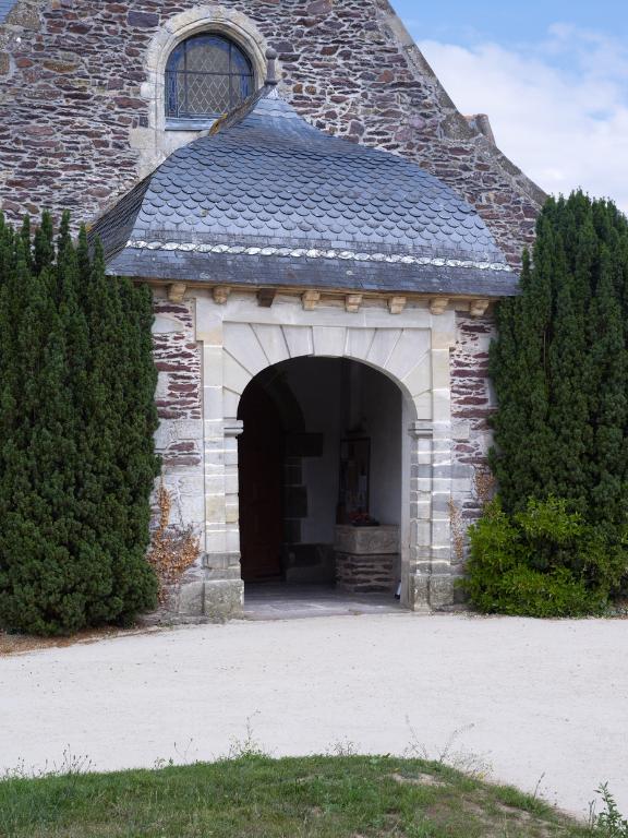 On accède à l'intérieur de l'édifice par un porche surmonté d'un toit en carène. Un pierre gravée porte la date de 1641 ainsi que l'inscription "Face mieux qui pourra" de chaque côté de la porte. Un bénitier en pierre sur soubassement de schiste est également visible dans le porche.
