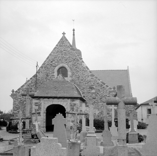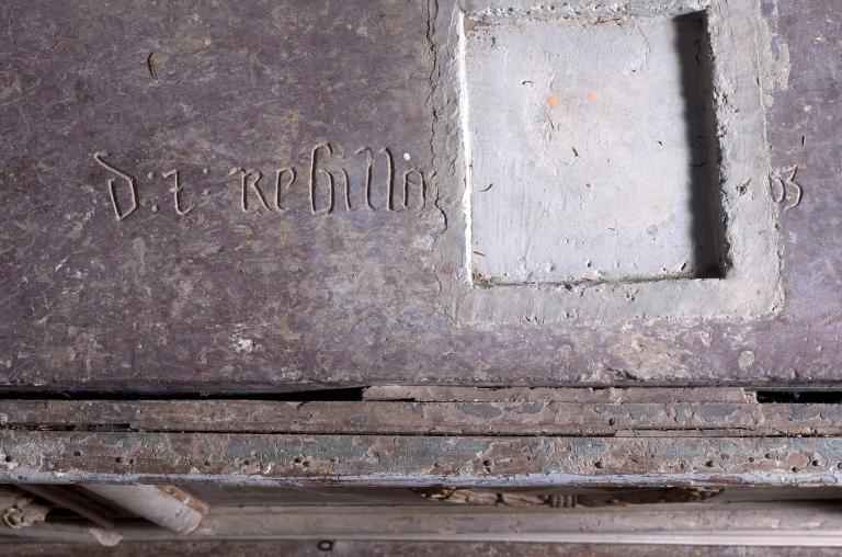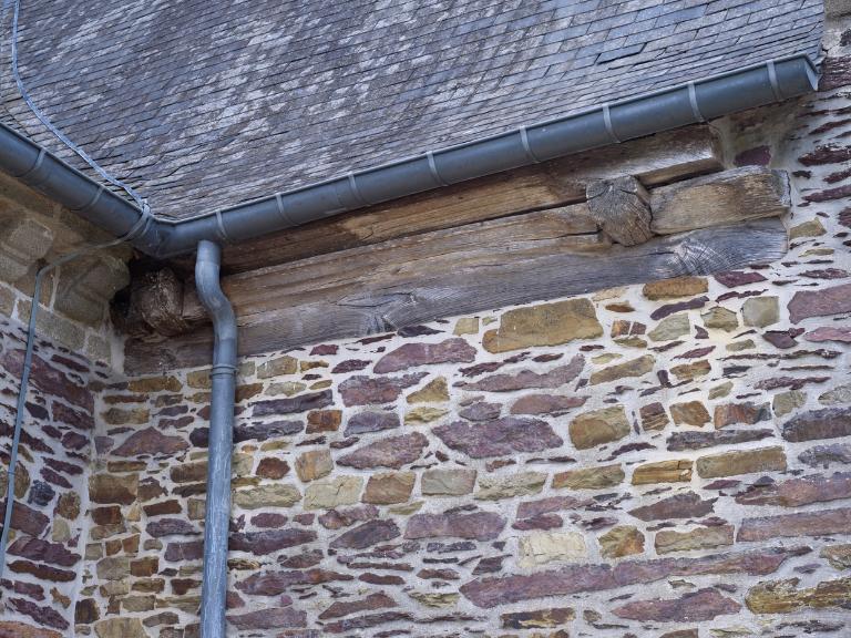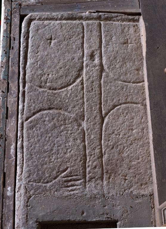A l'extérieur, au niveau l'entrée de la chapelle sud se trouve une pierre tombale en schiste portant l'inscription Yves, et décorée des armes des le Vayer.