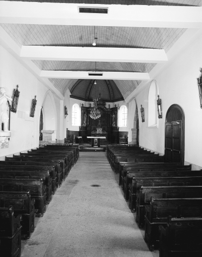 Plan en croix latine, lambris de couvrement, clocher latéral, porche latéral, chevet à pans coupés.