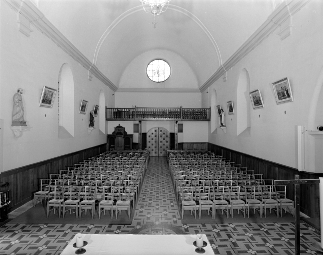 Plan allongé, sacristie à étage, vases acoustiques, chevet plat.