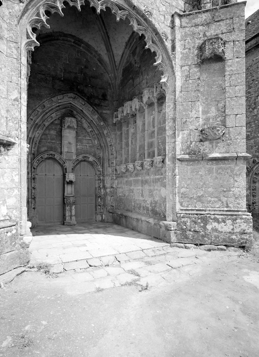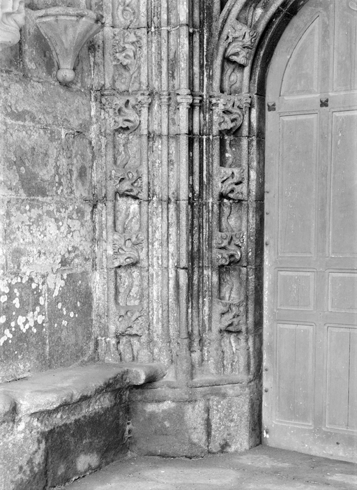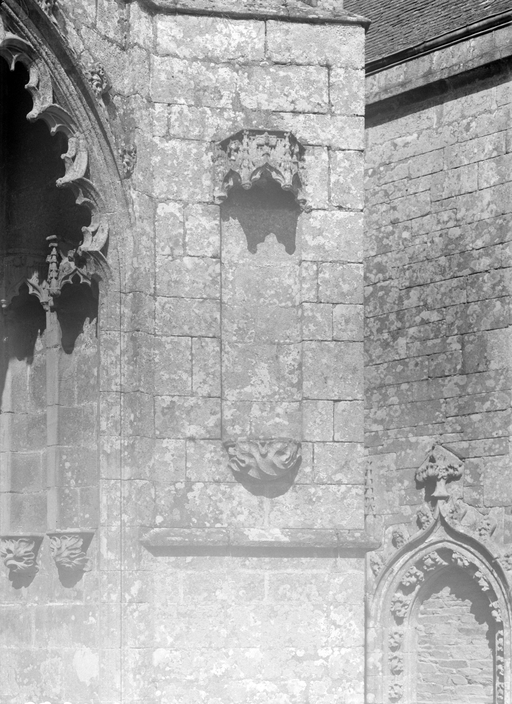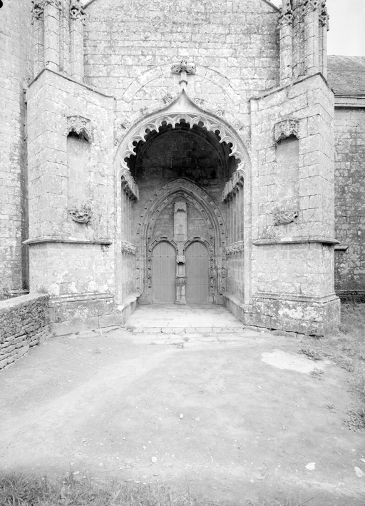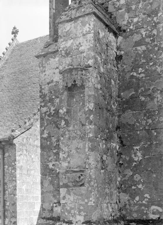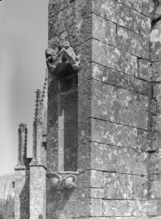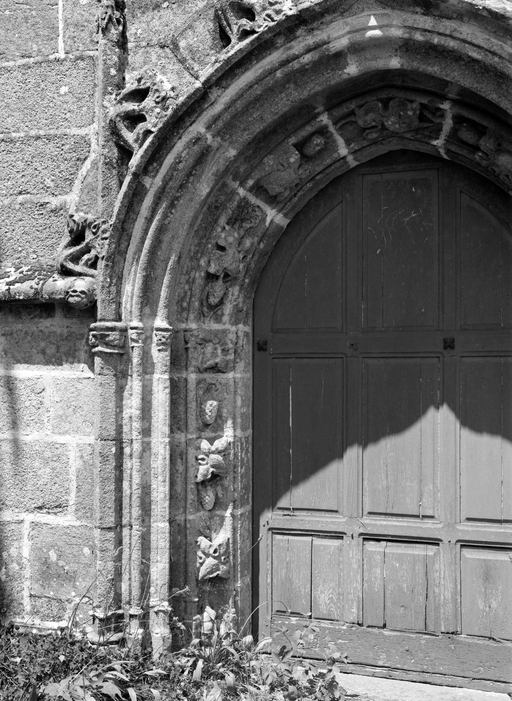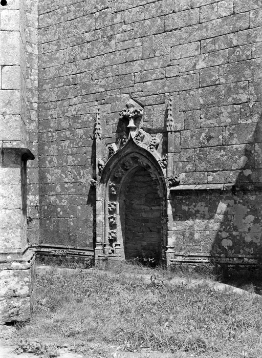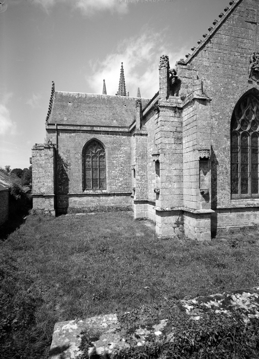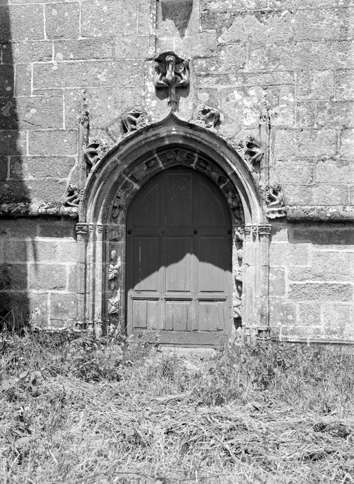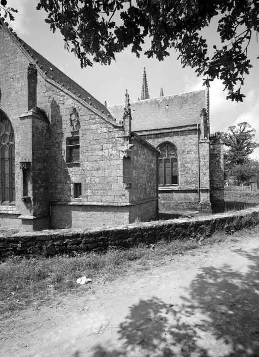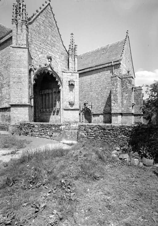 L´élévation sud présente une alternance d´avancées et de retraits de proportions variées qui, comme autant de temps forts et de temps faibles, rythment la composition, et frappe par son unité de style que renforce l´emploi de contreforts ornés de niches à dais et dont le sommet en glacis à quatre pans, forme moderne massivement employée sur le chantier de Kernascléden, sert de socle à des pinacles aigus posés à 45°. Quelques légères différences entre le choeur et le bras sud suggèrent une évolution. Tandis que les consoles des contreforts du choeur sont ornées de feuilles refouillées, celles du bras sud sont sculptées de personnages grotesques jouant avec des chiens, mais surtout la petite porte qui donne accès directement dans le choeur présente encore de grêles colonnettes à peine perceptibles comportant bases prismatiques en flacon et minuscules chapiteaux, modèle sans doute repris des transepts de Quimperlé, alors que celle qui est murée dans le mur ouest du bras sud, dont l´arc externe anguleux vient se fondre dans les piédroits sans chapiteau et les pinacles latéraux atteignent la hauteur du fleuron sommital, témoigne d´une évolution stylistique indéniable semblable à celle constatée sur le porche sud. Enfin, au-dessus de la petite porte du choeur, la superposition d´une niche à dais et d´une rose, percée pour l´élégance du motif, distinguent l'accès réservé au clergé et au seigneur supérieur. Le porche sud par l´association de grandes plages unies et de parties sculptées très localisées résume à lui seul l´économie esthétique de l´édifice. Il est encadré par deux larges et puissants contreforts angulaires qui semblent indiquer l´entrée, équilibrent la masse du pignon uni et lui confèrent une dimension monumentale. Ces contreforts sont ornés sur leurs faces latérales, de part et d´autre de l´entrée, de niches à dais semblables à celles qui ornent les autres contreforts de la chapelle et couronnés d´un faisceau de pinacles de section cylindrique dont le modèle est directement emprunté au chevet de Kernascléden. Sur ce frontispice presque dépouillé, le lambrequin à arcs trilobés et accolade ornée de feuilles retournées qui souligne l´ouverture du porche prend toute sa valeur. À l´image de l´ensemble du décor de la chapelle, l´intérieur du porche illustre ce goût pour une certaine épuration stylistique qui vise à l´efficacité. Les deux séries de niches prévues pour recevoir les statues des apôtres reprennent en continu le principe de celles des contreforts qui se résume à un simple enfoncement dans le mur dépourvu de toutes colonnettes ou moulures. Cette conception épurée, adaptée aux proportions du porche, vise également à valoriser le portail lui-même, principal accès à l´intérieur de la chapelle. Ce dernier - une grande arcade en tiers-point incluant deux portes géminées de forme et de décor semblables, sous un tympan plein devant lequel devait s´inscrire une statue de trumeau - est une transposition trait pour trait, et de dimensions identiques, de celui du chœur de Kernascléden. La même savante économie se retrouve dans la sculpture du porche dont Léon de Groër fait remarquer le style particulier. Les socles des niches, au lieu d´être sculptés de figures ou de feuillages retournés et refouillés comme sur le chœur, sont ici ornés d´une unique et large feuille souple qui semble comme plaquée par le vent : ce trait, accentué sur les contreforts de l´entrée, révèle une évolution qui se démarque nettement de l´ornementation recherchée et précieuse, presque méticuleuse, rencontrée à Kernascléden. Là encore et comme pour la composition de la façade, loin d'être due seulement à une différence dans le budget du chantier, il s´agit bien d´une recherche de style.