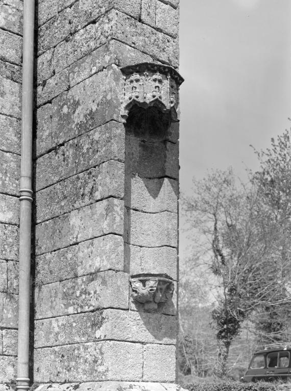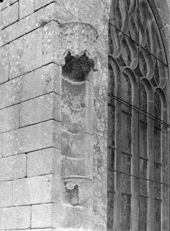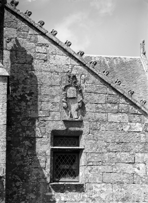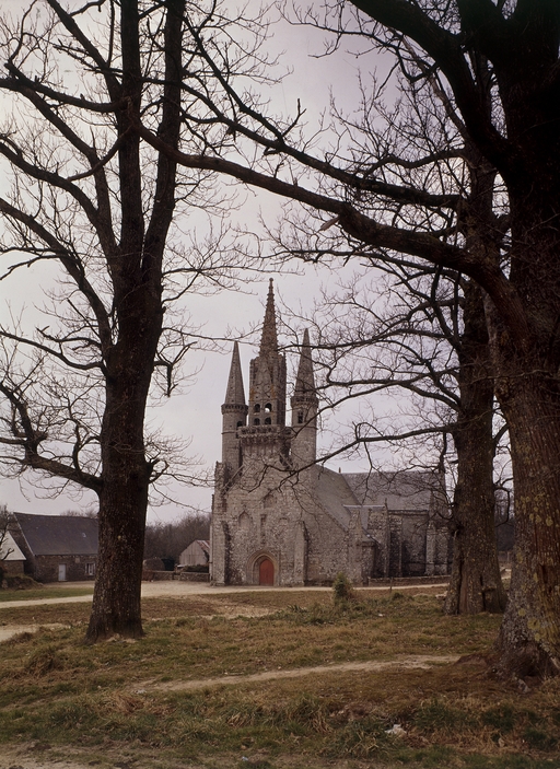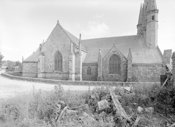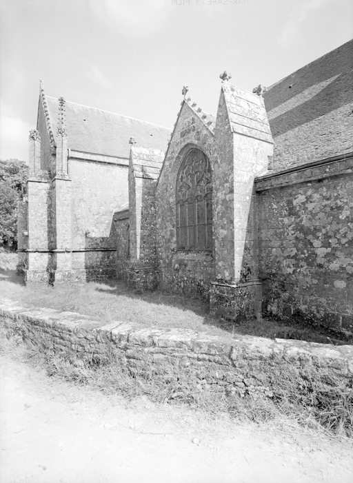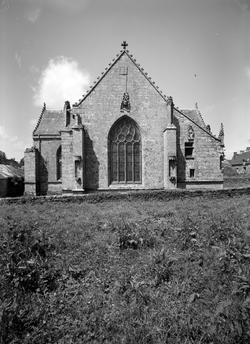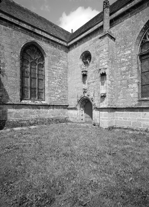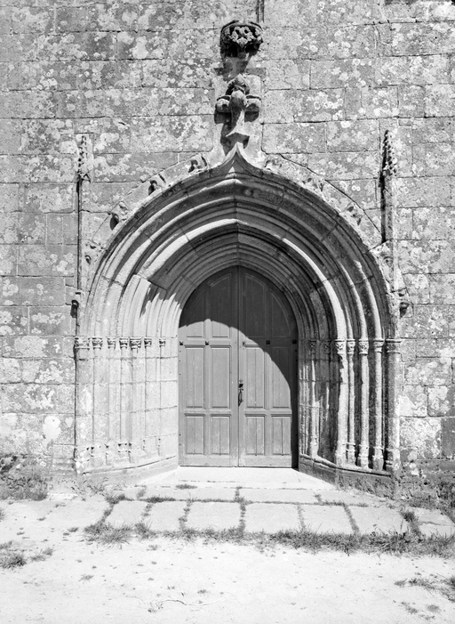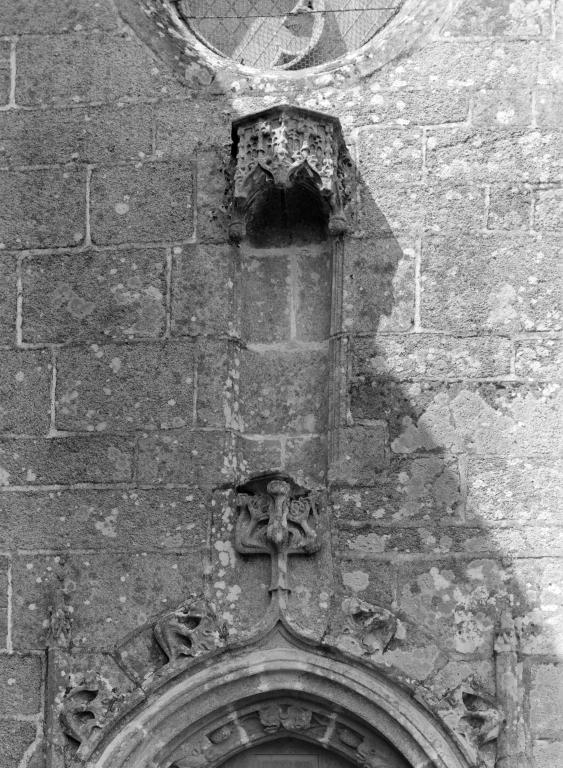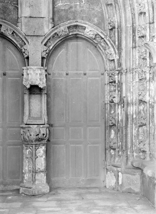 L´élévation sud présente une alternance d´avancées et de retraits de proportions variées qui, comme autant de temps forts et de temps faibles, rythment la composition, et frappe par son unité de style que renforce l´emploi de contreforts ornés de niches à dais et dont le sommet en glacis à quatre pans, forme moderne massivement employée sur le chantier de Kernascléden, sert de socle à des pinacles aigus posés à 45°. Quelques légères différences entre le choeur et le bras sud suggèrent une évolution. Tandis que les consoles des contreforts du choeur sont ornées de feuilles refouillées, celles du bras sud sont sculptées de personnages grotesques jouant avec des chiens, mais surtout la petite porte qui donne accès directement dans le choeur présente encore de grêles colonnettes à peine perceptibles comportant bases prismatiques en flacon et minuscules chapiteaux, modèle sans doute repris des transepts de Quimperlé, alors que celle qui est murée dans le mur ouest du bras sud, dont l´arc externe anguleux vient se fondre dans les piédroits sans chapiteau et les pinacles latéraux atteignent la hauteur du fleuron sommital, témoigne d´une évolution stylistique indéniable semblable à celle constatée sur le porche sud. Enfin, au-dessus de la petite porte du choeur, la superposition d´une niche à dais et d´une rose, percée pour l´élégance du motif, distinguent l'accès réservé au clergé et au seigneur supérieur. Le porche sud par l´association de grandes plages unies et de parties sculptées très localisées résume à lui seul l´économie esthétique de l´édifice. Il est encadré par deux larges et puissants contreforts angulaires qui semblent indiquer l´entrée, équilibrent la masse du pignon uni et lui confèrent une dimension monumentale. Ces contreforts sont ornés sur leurs faces latérales, de part et d´autre de l´entrée, de niches à dais semblables à celles qui ornent les autres contreforts de la chapelle et couronnés d´un faisceau de pinacles de section cylindrique dont le modèle est directement emprunté au chevet de Kernascléden. Sur ce frontispice presque dépouillé, le lambrequin à arcs trilobés et accolade ornée de feuilles retournées qui souligne l´ouverture du porche prend toute sa valeur. À l´image de l´ensemble du décor de la chapelle, l´intérieur du porche illustre ce goût pour une certaine épuration stylistique qui vise à l´efficacité. Les deux séries de niches prévues pour recevoir les statues des apôtres reprennent en continu le principe de celles des contreforts qui se résume à un simple enfoncement dans le mur dépourvu de toutes colonnettes ou moulures. Cette conception épurée, adaptée aux proportions du porche, vise également à valoriser le portail lui-même, principal accès à l´intérieur de la chapelle. Ce dernier - une grande arcade en tiers-point incluant deux portes géminées de forme et de décor semblables, sous un tympan plein devant lequel devait s´inscrire une statue de trumeau - est une transposition trait pour trait, et de dimensions identiques, de celui du chœur de Kernascléden. La même savante économie se retrouve dans la sculpture du porche dont Léon de Groër fait remarquer le style particulier. Les socles des niches, au lieu d´être sculptés de figures ou de feuillages retournés et refouillés comme sur le chœur, sont ici ornés d´une unique et large feuille souple qui semble comme plaquée par le vent : ce trait, accentué sur les contreforts de l´entrée, révèle une évolution qui se démarque nettement de l´ornementation recherchée et précieuse, presque méticuleuse, rencontrée à Kernascléden. Là encore et comme pour la composition de la façade, loin d'être due seulement à une différence dans le budget du chantier, il s´agit bien d´une recherche de style.
